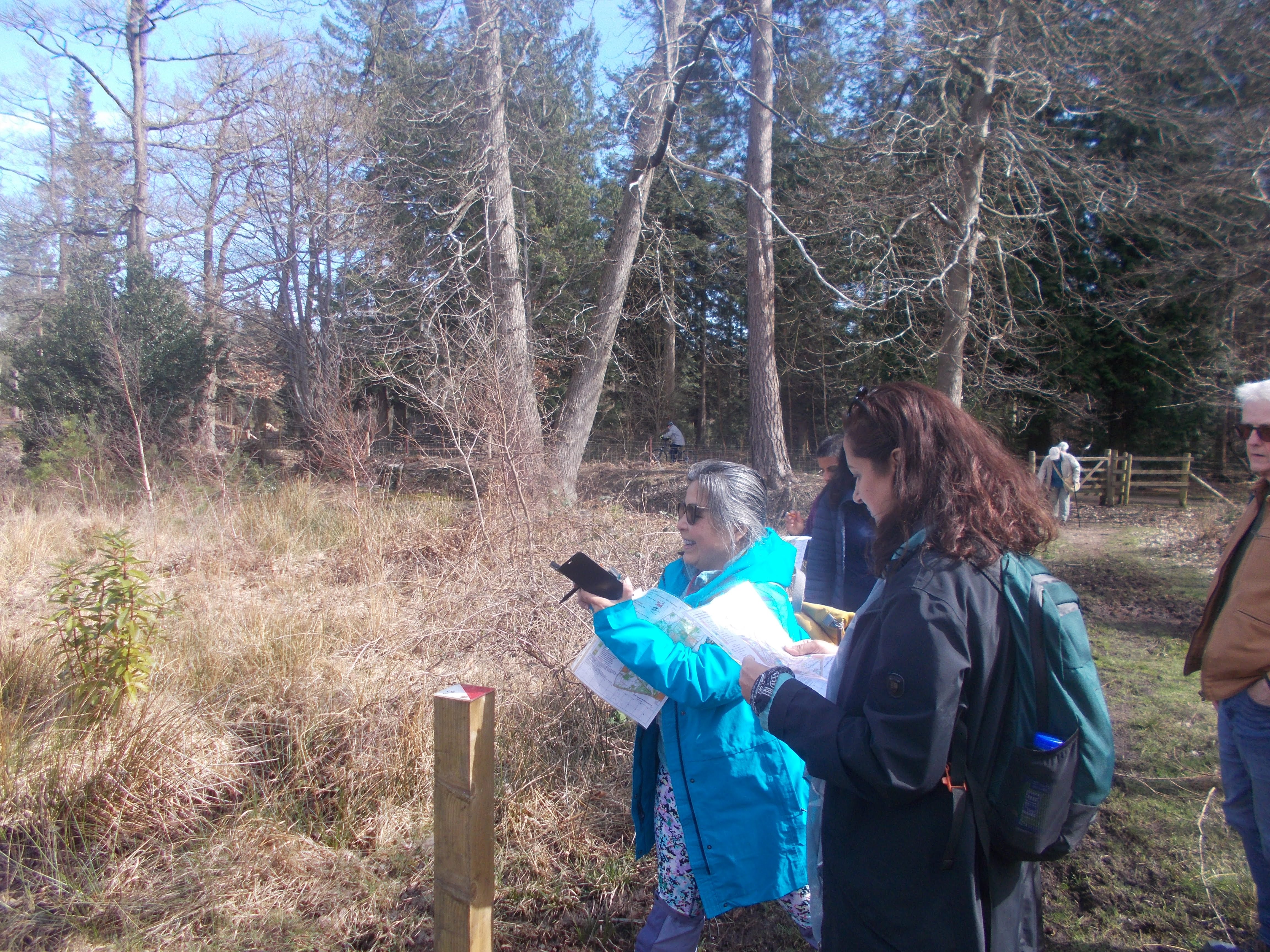 On a very sunny morning eight orienteers arrived at the Black Park lakeside café. Some had taken part in the Black Park Parkrun earlier (over 700 runners). Over coffee we went through the orienteering map and route, then Luna greeted the latecomers and we were off. We took it in turns to use the map to find the hidden marker posts in the woods. Each post has a number (on the map) and a letter which must be noted to complete the course. We crossed by the Go Ape Course. "Can I do that, Derek?" asked Prem, prompting a firm "No" in response. Soraya led us to the next marker which took some searching in the very high gorse bushes. On route to the following marker, we happened upon a complete film set in the woods. Pinewood Studios use Black Park for location shooting; this set appeared to be for a Lord of the Rings-style movie, all camouflaged in the woods. We detoured off the park to the Bridgettine Convent with its shrine. We completed the course, finding the final markers before arriving back at the lakeside café for well-deserved tea and buns. As we took in the views, Harpreet, inspired by the nearby Pinewood, recounted her recent experiences as a film extra, the most notable being the recent wedding in Albert Square.