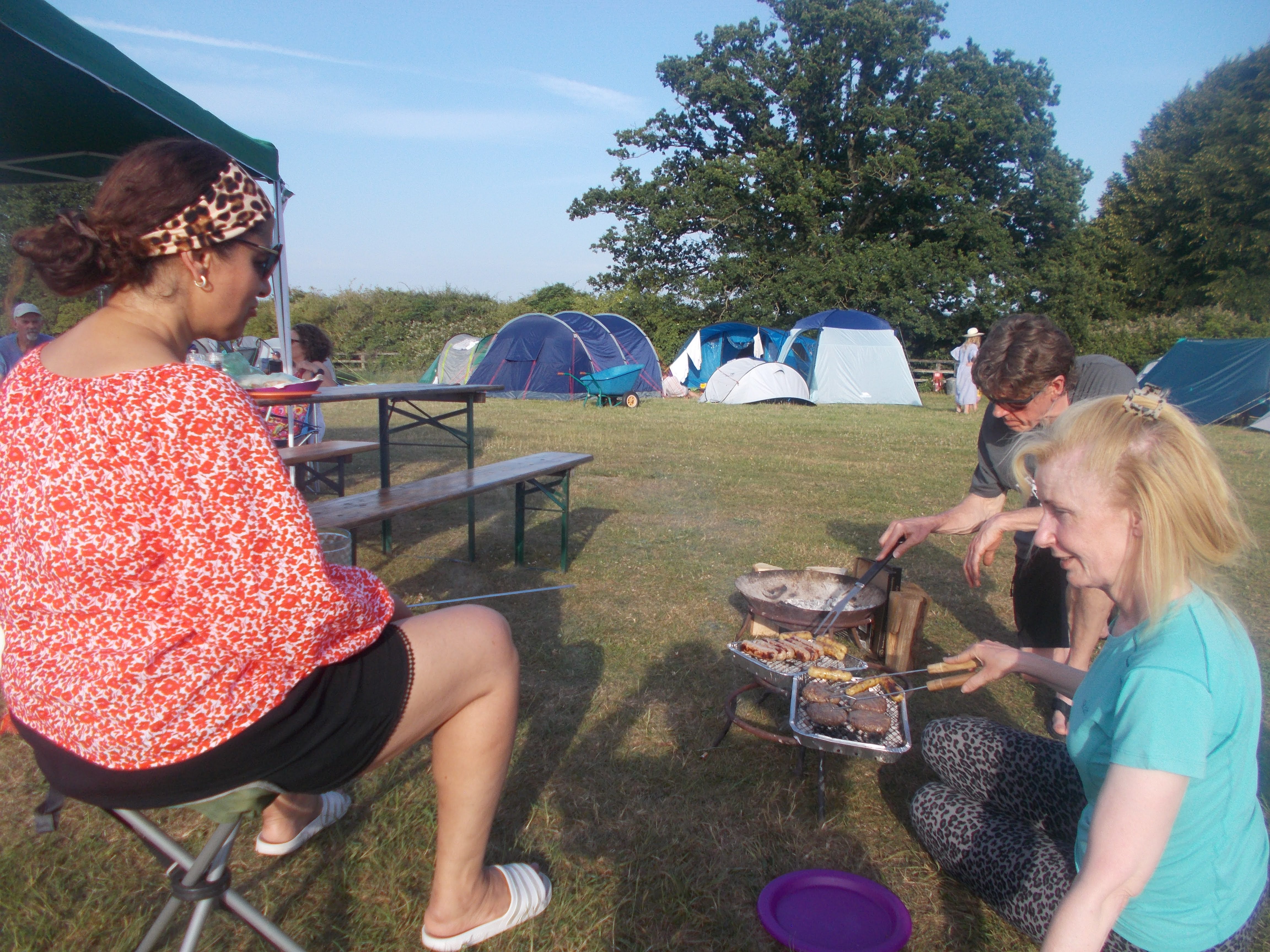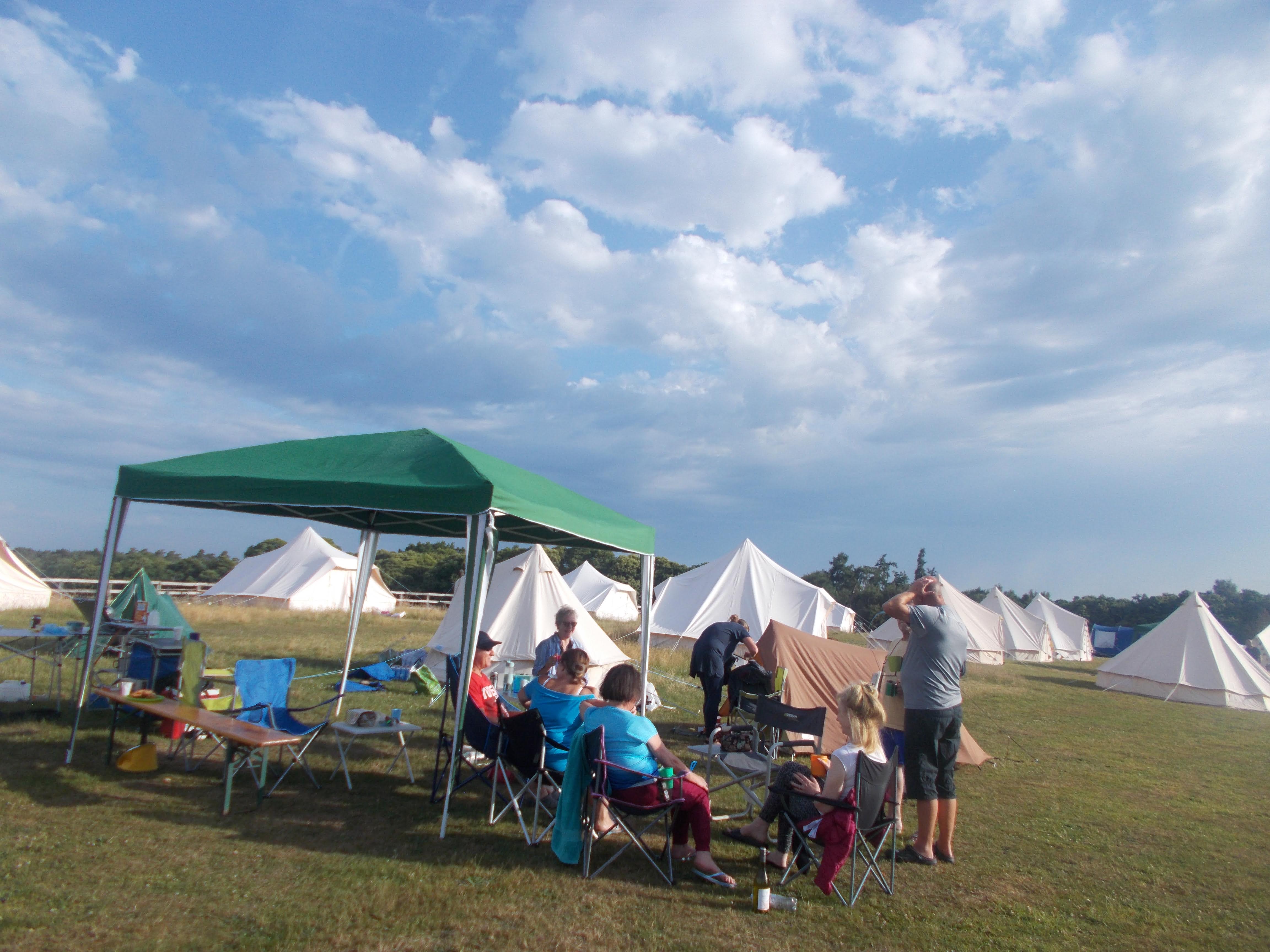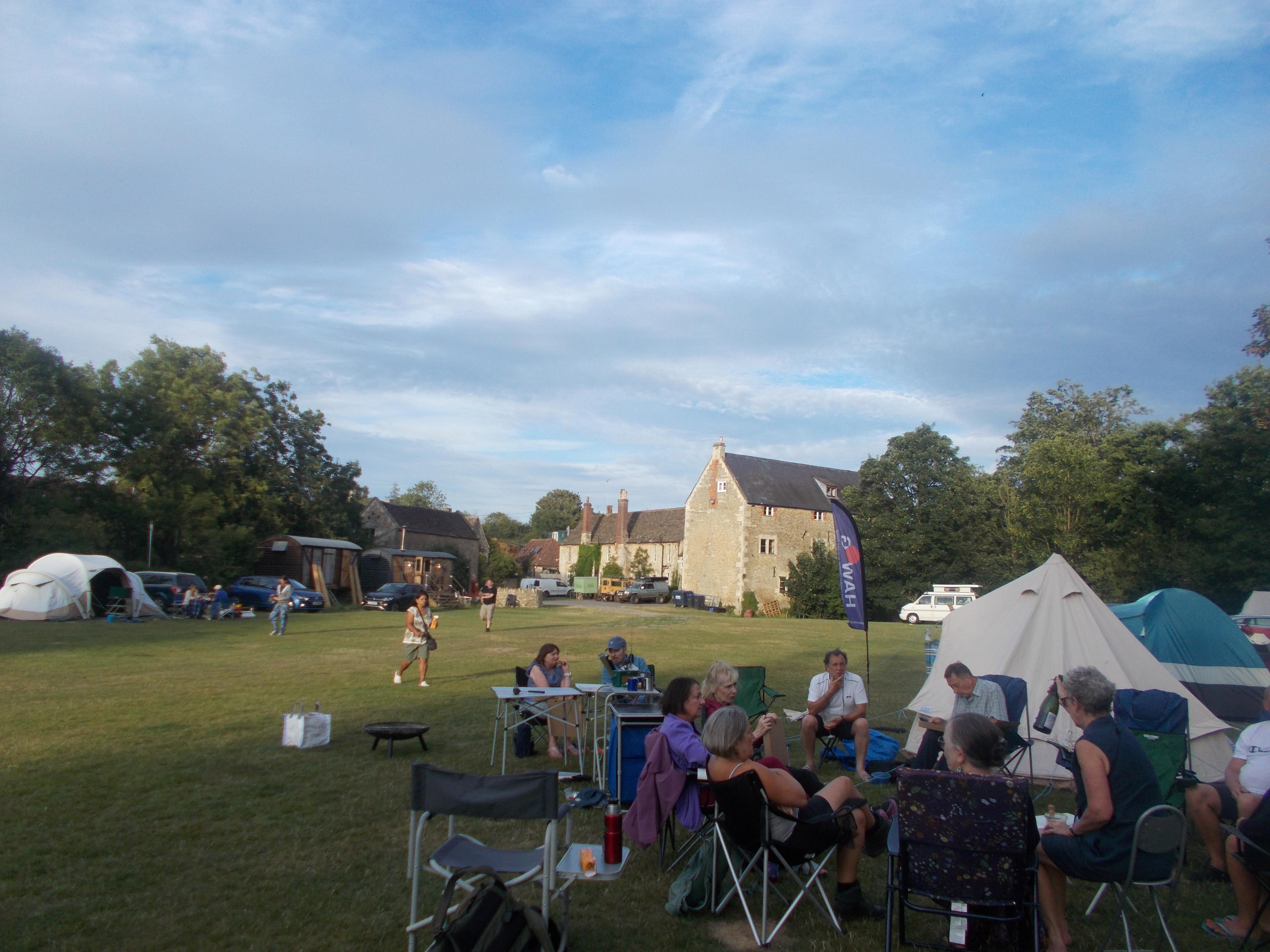 Our first camping expedition of the year saw us return to Home Farm at Radnage. We enjoyed great weather for the three days as always. The site has stunning views over the valley with a very relaxed management style. We pitched camp to the sound of Boom Radio with Louise sharing out the rather spiffing Victoria Sponge cake to all. Runi led the afternoon walk through nearby tracks and meadows. Two very well-groomed horses galloped over to greet us in a buttercup meadow, and we also passed sheep, lambs and alpacas on a very scenic route. We had a sumptuous meal in the Crown after a surprise announcement. Then time to light the campfire, we gathered around the blazing logs for Neil, Soraya and Coogee to lead the sing-song on three ukuleles in perfect harmony.