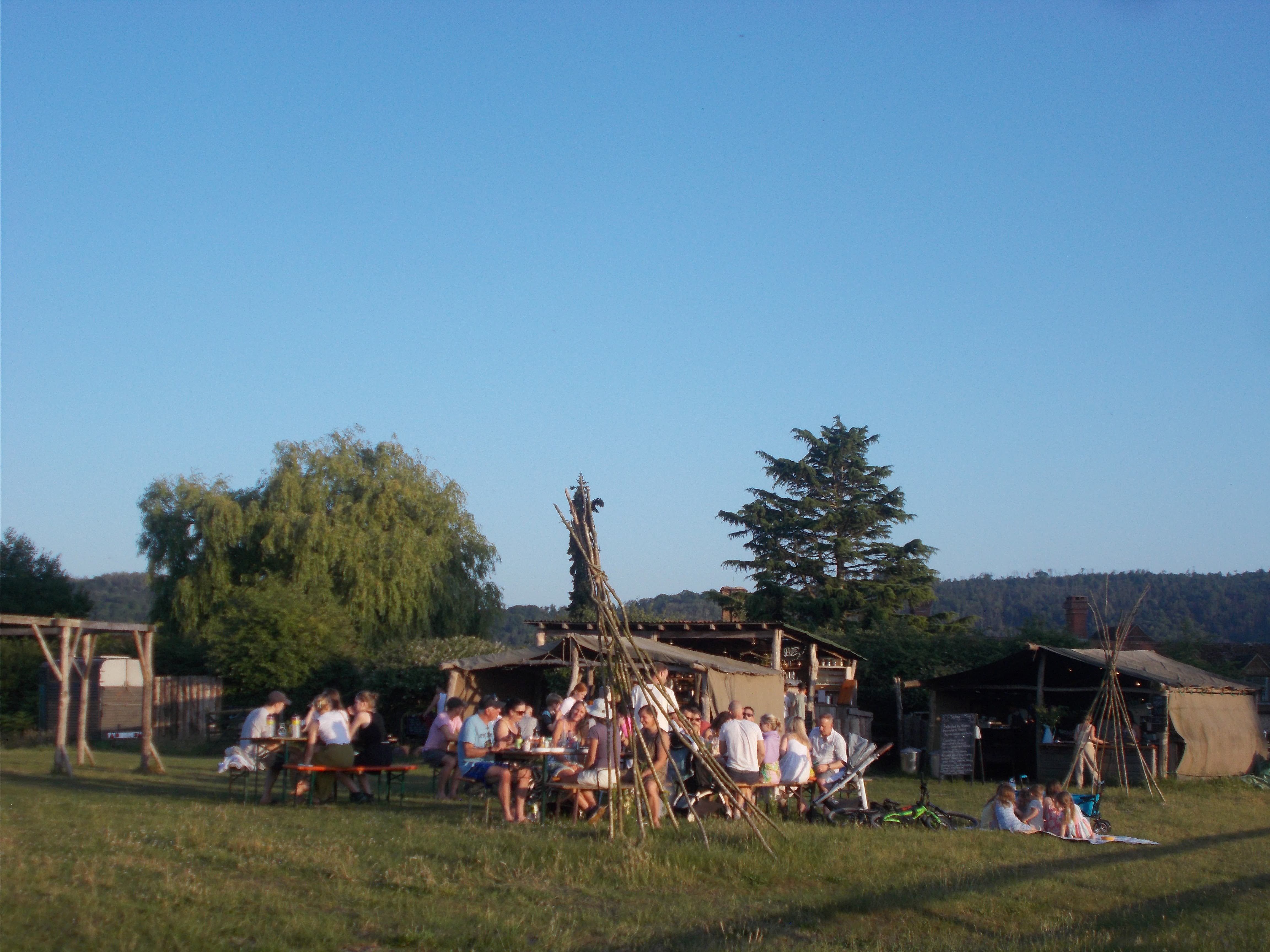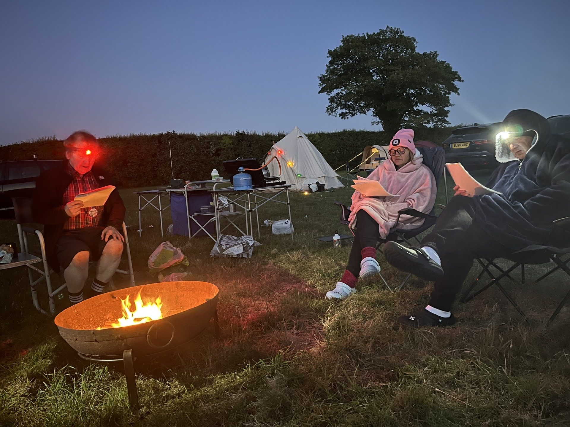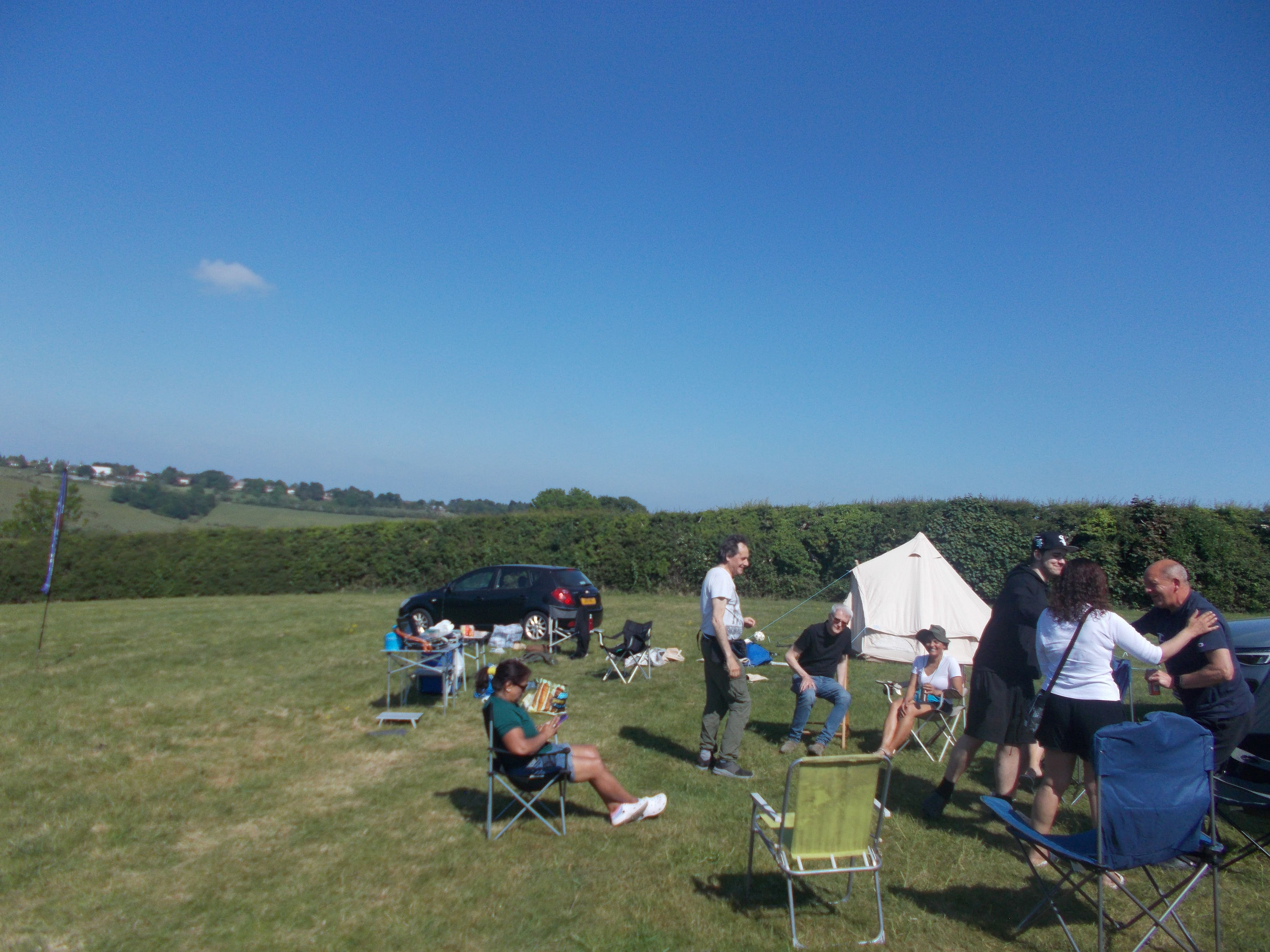 Our first camping expedition of the year saw us return to Home Farm at Radnage. We enjoyed great weather for the three days as always. The site has stunning views over the valley with a very relaxed management style. We pitched camp to the sound of Boom Radio with Louise sharing out the rather spiffing Victoria Sponge cake to all. Runi led the afternoon walk through nearby tracks and meadows. Two very well-groomed horses galloped over to greet us in a buttercup meadow, and we also passed sheep, lambs and alpacas on a very scenic route. We had a sumptuous meal in the Crown after a surprise announcement. Then time to light the campfire, we gathered around the blazing logs for Neil, Soraya and Coogee to lead the sing-song on three ukuleles in perfect harmony.