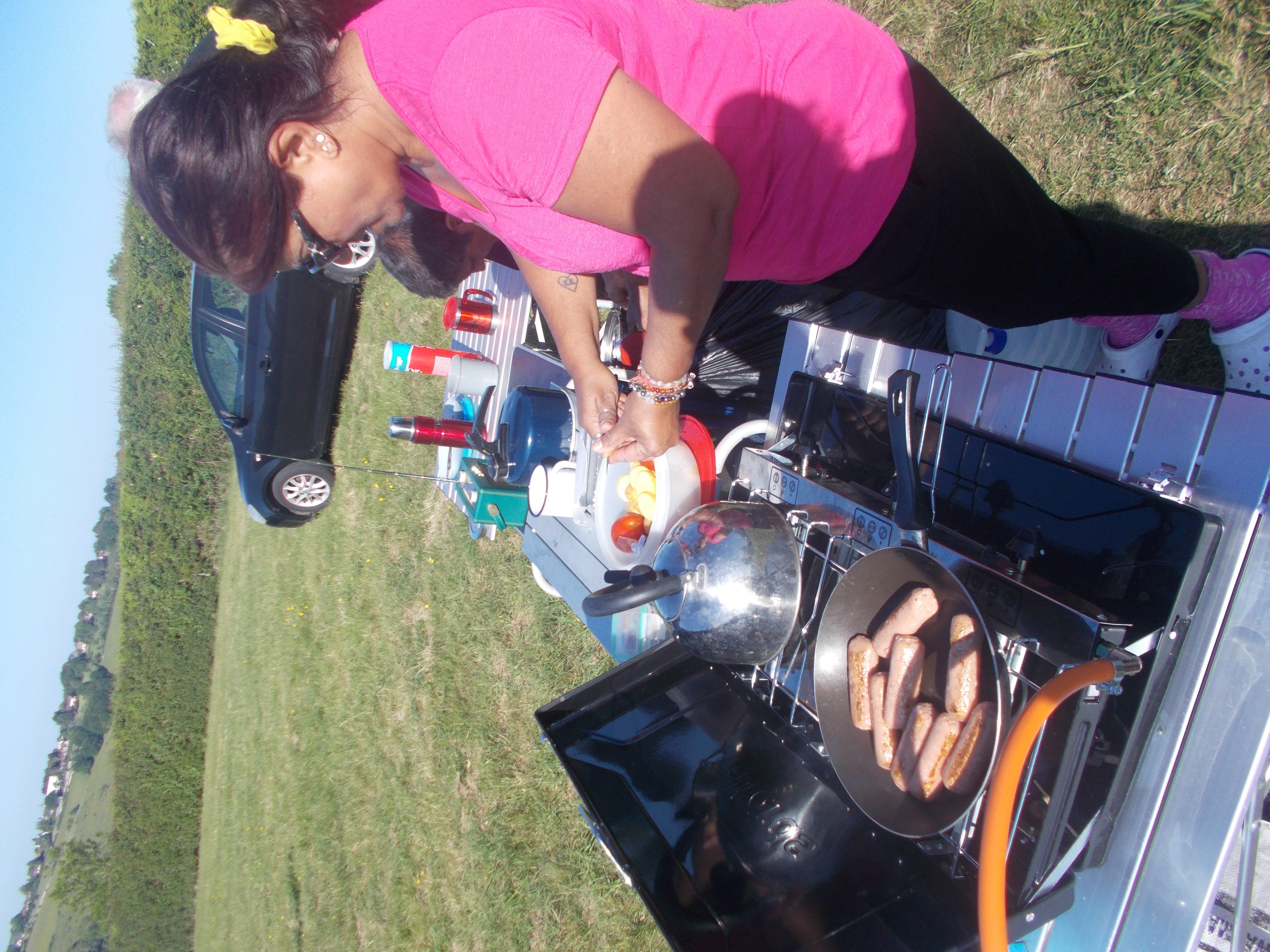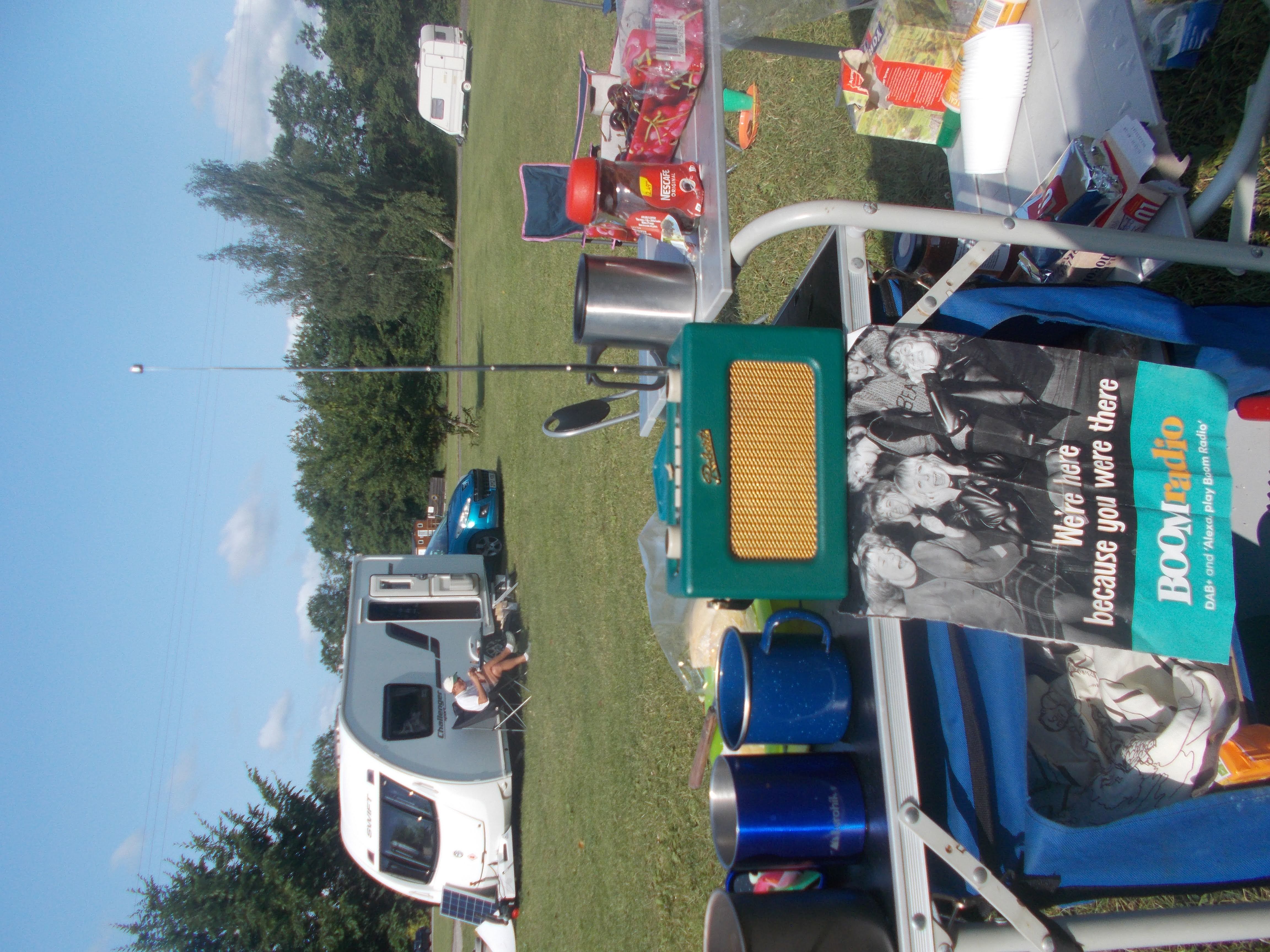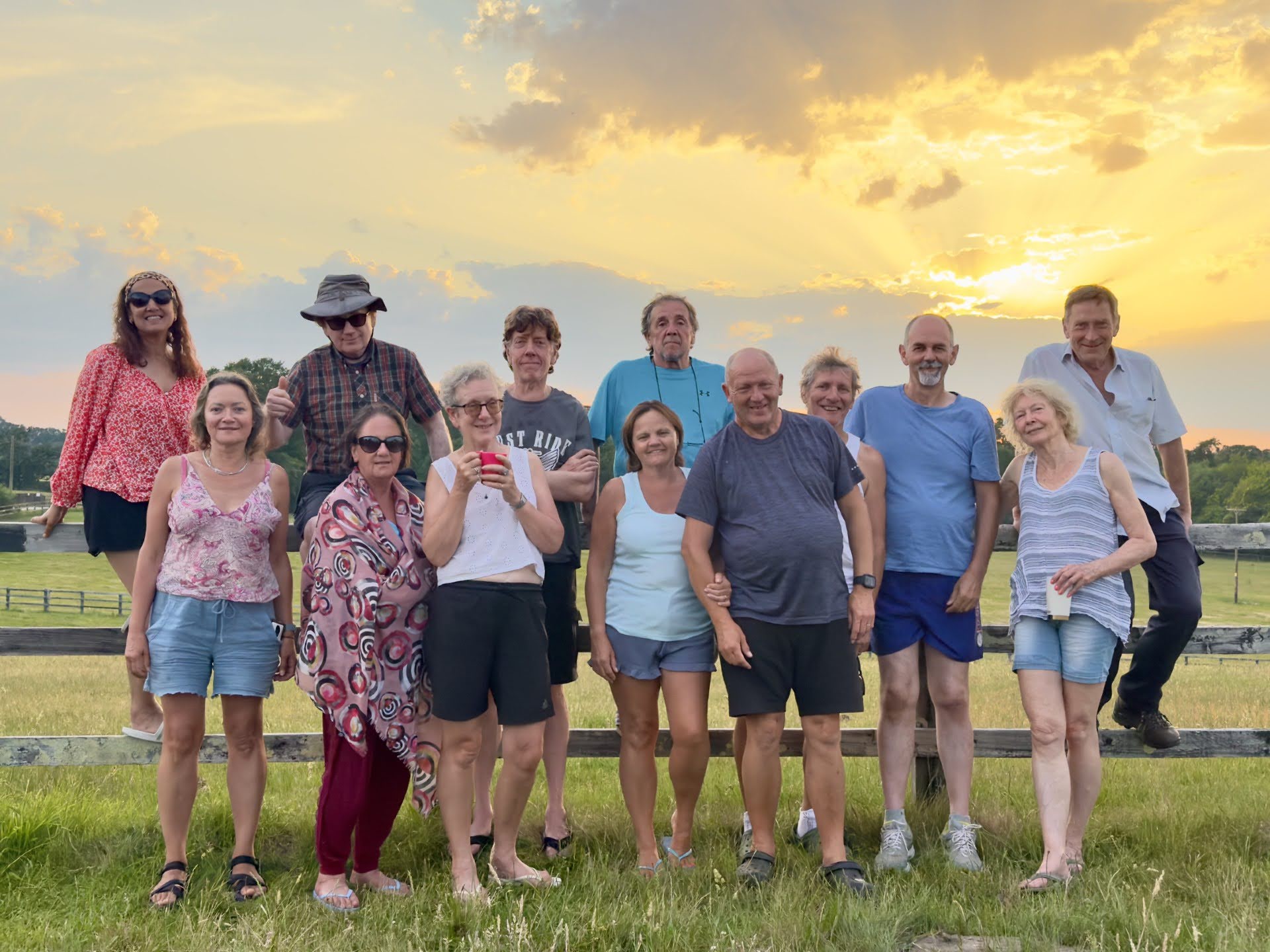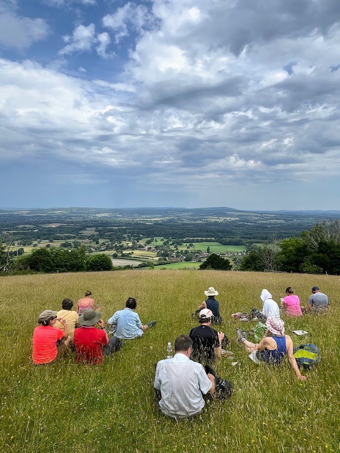 On Saturday the early sun and Boom Radio woke us early for Coogee's strong coffee and Kevin's breakfast baps. Runi led the 10-mile walk, a very scenic route through buttercup meadows and sheep pastures passing the villages of Bledlow Ridge and Radnage. We stopped at the medieval church with Nick pointing out the restored stained glass. We then climbed to the summit of West Wycombe hill for our picnic at the viewpoint. The Dashwood Georgian church and mausoleum were closed for Netflix filming of "Bridgerton". Harpreet explained she was due to play a Regency courtier in the series the next week. Red kites were a feature the entire weekend and they soared around the viewpoint. We then explored the picturesque village of West Wycombe with its coaching inns and cottages. Lunch in the sun-filled beer garden at the George and Dragon. Just time to visit the annual cactus show at the village hall, such a vast variety of cacti on display with some awfully nice chocolate cake at the Apple Orchard tea rooms. Our route back took in more hills and fields of maize before the climb to 'The City'. Back at site, to celebrate the song contest, Boom Radio were playing all the Eurovision winners back to Lulu and Dana. The barbecue was soon blazing away with the red kites circling. Brian had a mellow Mike-sized feast topped by a Kevin-invented "Chili Dog Roll". Campfire lit, on a perfect night for sky gazing, time for fireside yarns from Coogee of his jolly japes when working at the Grunwick frontline and Saurabh of his forthcoming trek across Africa.