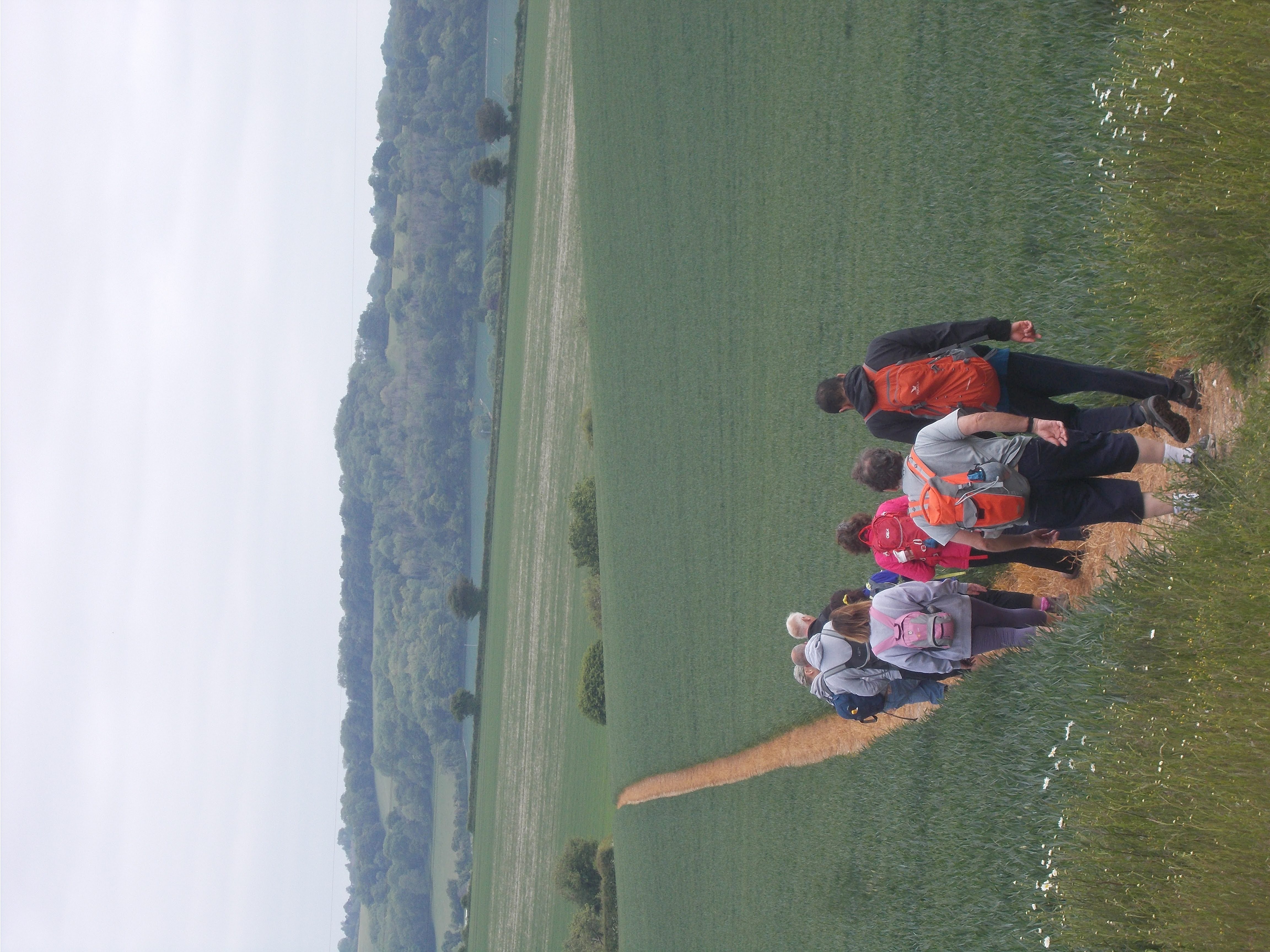 Grove Farm made the perfect lunch stop. The farm has a pick your own fruit facility, however we were a little late in the season, as no strawberries were evident and the place looked closed. Picnicking in the corner of a field was very pleasant. Not long after lunch we had a quick pub stop at the Swan in Ivinghoe Aston. A relaxing half hour was spent with our respective beverages and then onwards to the high point of the walk, Beacon Hill, the highest point of the Ivinghoe Hills. Ascending by the quickest but steepest route! It was a bit of a trial, but we made it. Out of breath, all had big smiles on their faces. A red kite came quite close. A few of us pondered on the notion that it could smell weakness in the group and was merely waiting for stragglers to fall by the wayside. The views from Beacon Hill are truly stunning. Fully rested, we a had a few pictures taken. The route could be seen in the distance over the rolling hills. Now on the Ridgeway we walked over Pitstone Hill and down into the Aldbury Nowers, a rather pleasant wood, the track littered with new fallen leaves. Finally back to the station and the end of a cracking day.