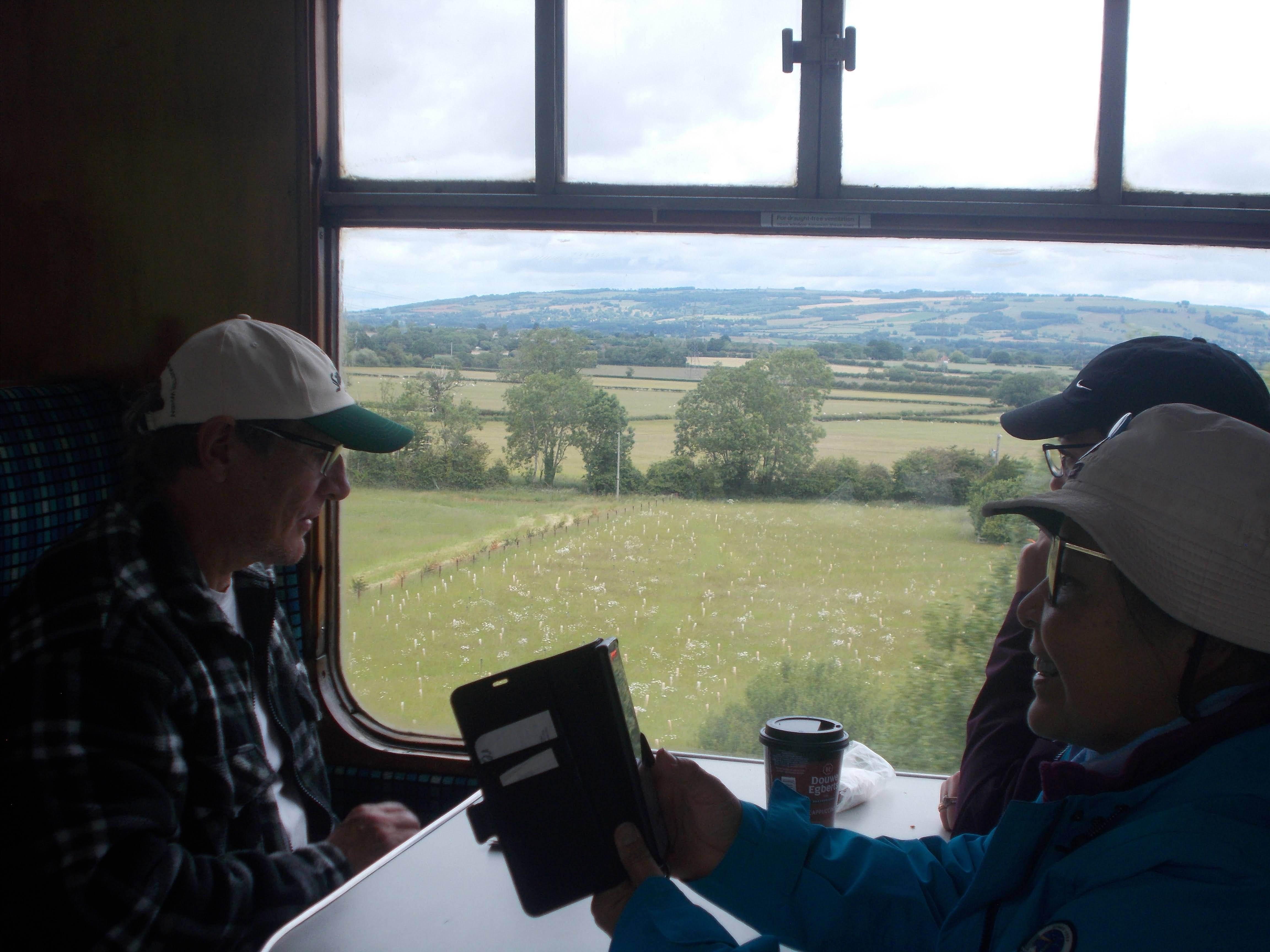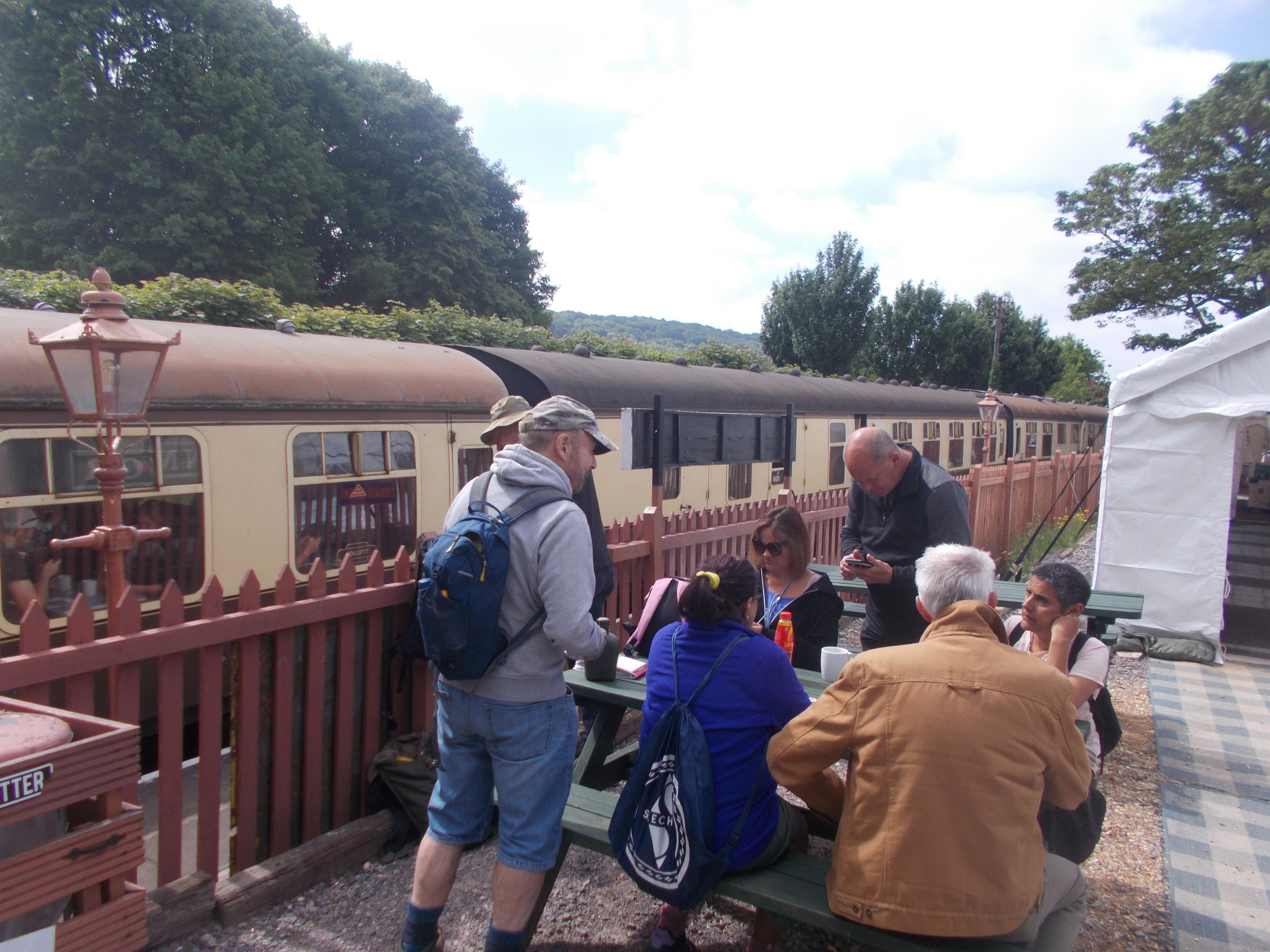 On Sunday we breakfasted on Soraya's unique porridge bread and struck camp to Boom. We headed for Chinnor for the steam railway. At the station caf@eacute; we stopped for bacon butties and cheered the arrival of the heritage train. Brian led the 5-mile walk along the Ridgeway. After climbing to the ridge, we took the chalk track eastwards. The sun came out to shine on the meadows and the cricket green ahead. At Bledlow village we strolled past the manors and cottages with wisteria and rose gardens in bloom. We reached the ever-delightful Lyde Gardens and wandered around the water gardens with its tropical features. Michael pointed out the mock orange flowers and the variety of ferns. As the afternoon sun beat down, we stopped at the village green for a jolly decent Sunday roast at The Lions. We took in the views of this timeless village with the vintage train's whistle ringing out in the distance.