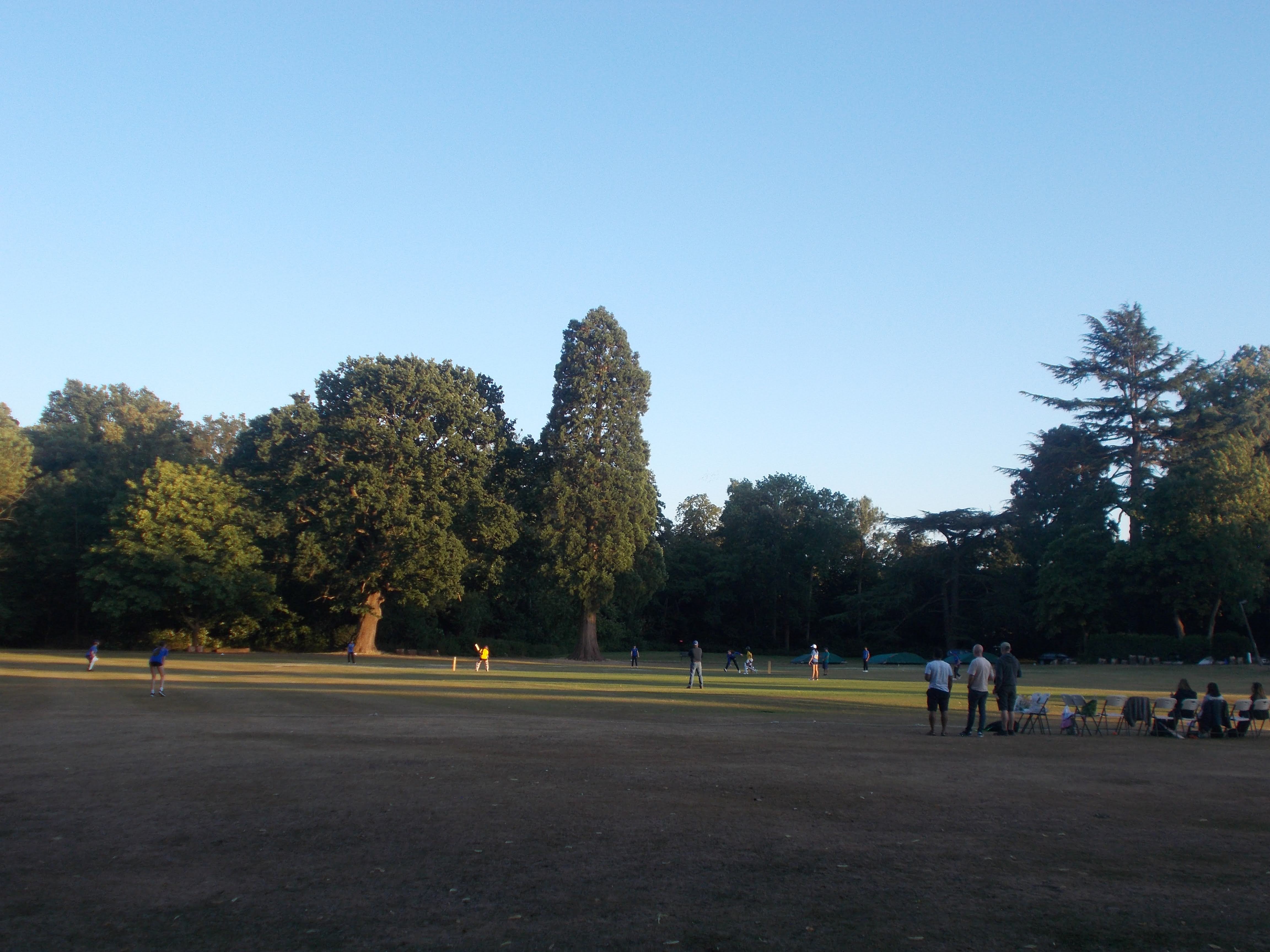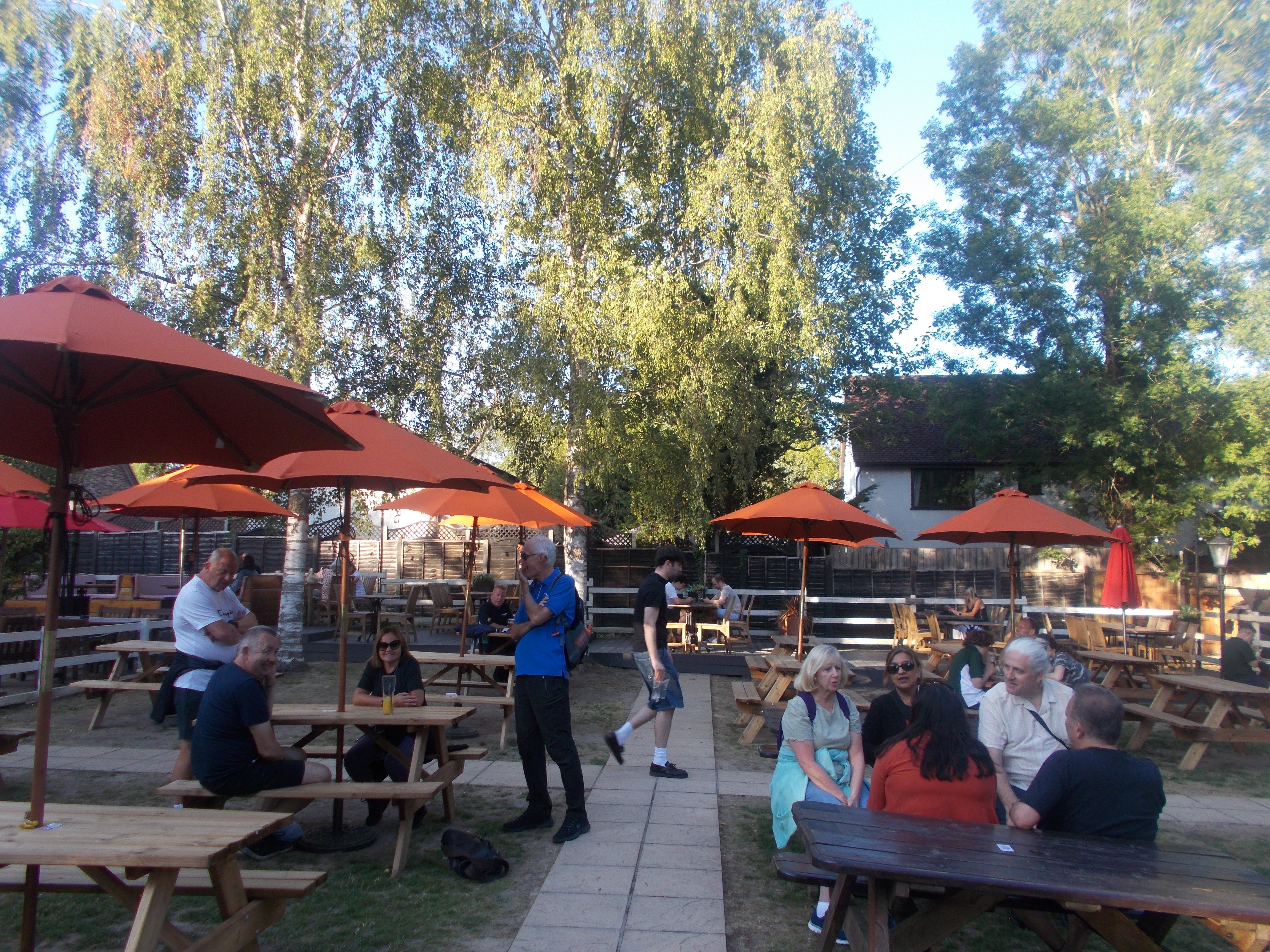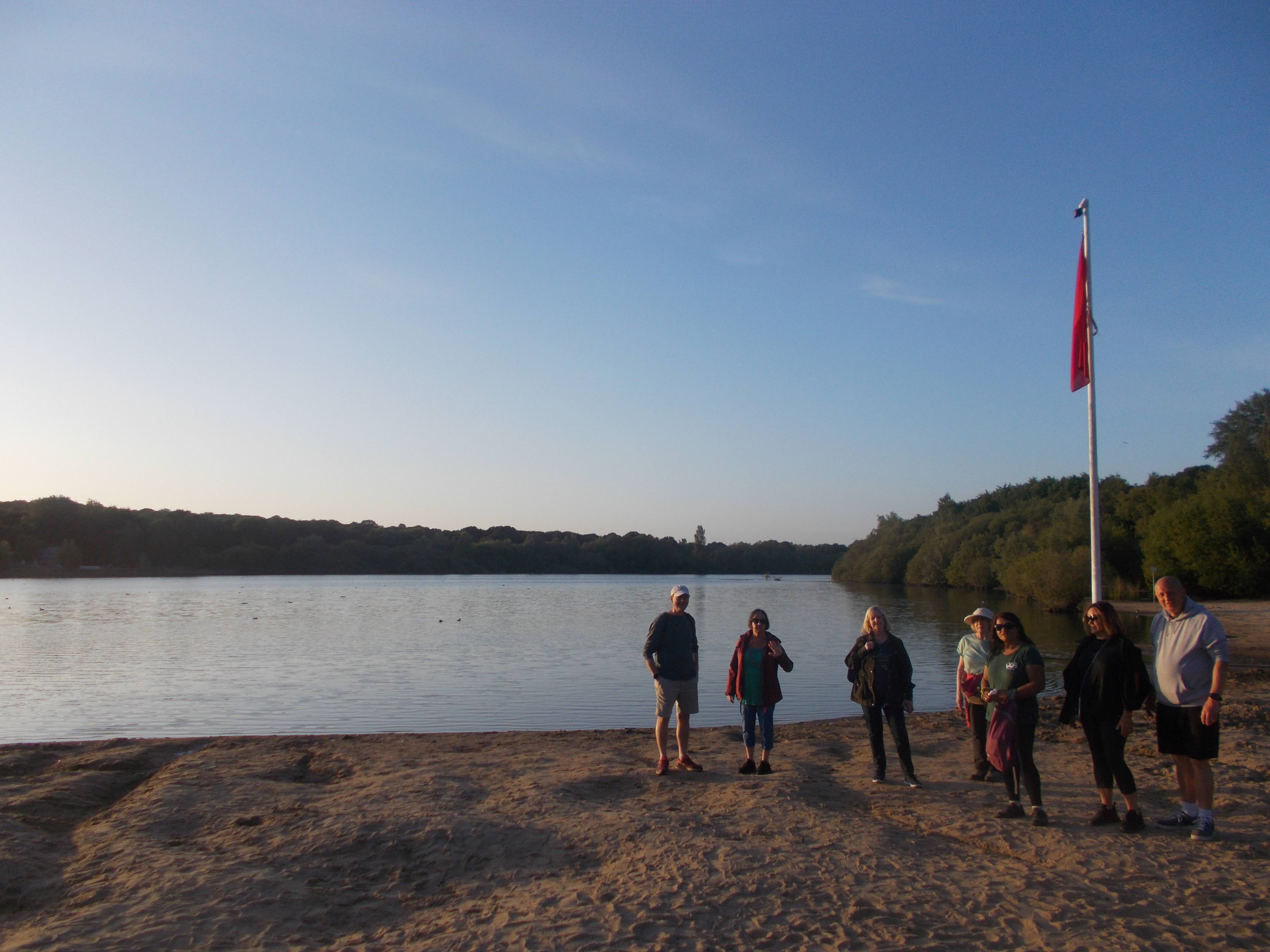 Ten walkers met on a sunny summer evening at Northwood. We entered the Northwood Hills meadows where a cricket match was in progress. We soon reached Haste Hill summit for inspiring views west over the woods and golf course. We then navigated our way through Ruislip Woods and the hard-to-find level crossing of the railway. Then joined the Lido footpath to arrive at the beach. We took in the views across the lido, Neil and Kerry recounting their childhood swims across the water. Then back through the woods, following the bridleway to Fore Street. Here we soon reached the Eastcote cricket fields and onto the Case. The beer garden was popular on the warm evening. We caught up on last week's camping trip, with Con reciting tall tales of his time in the Tropics.