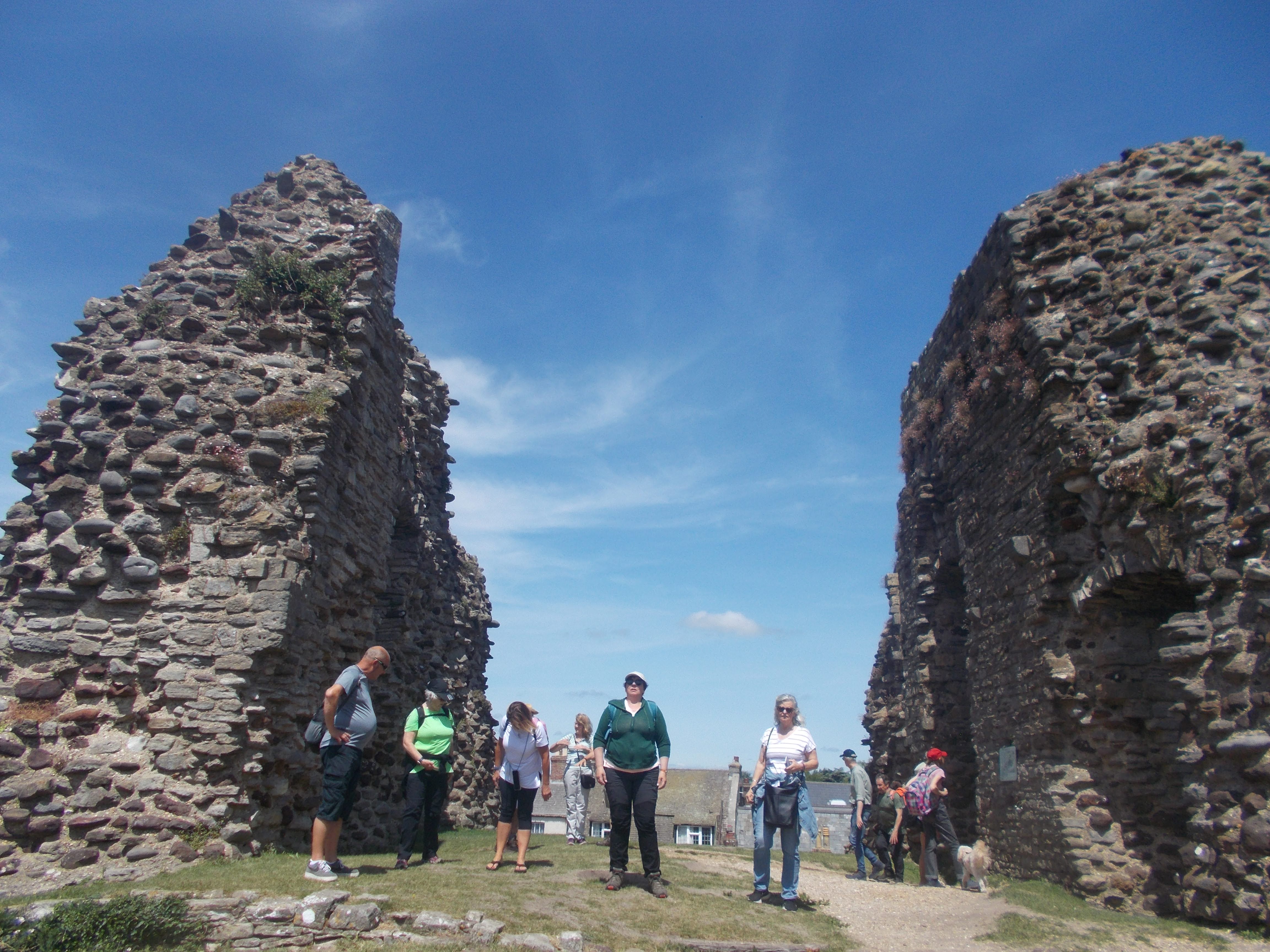 Suitably replete, we walked across fields to the wetland reserve near the historic village of Greywell. A long boardwalk gave excellent views of the reed beds and the beautifully clear water from the nearby chalk springs. We encountered another 12th century Norman church, this time with a kettle, tea and a courtesy tray of biscuits. Beyond Greywell, we walked over the entrance to the Greywell Tunnel of the Basingstoke Canal. This had a major collapse in 1932, and now marks the end of the canal. Our loss is a gain for bats, for the tunnel now hosts the largest bat colony in the UK. A short walk along the canal took us to the ruin of Odiham Castle, thought to be where King John spent the night on his way to sign Magna Carta. It had a colourful history until after ownership of Henry VIII, when it gradually fell into disrepair. Turning off the canal, we made our way through woods and commons, crossing the busy M3 motorway by way of an elaborate spiral footbridge, designed for horses to cross without encountering any steps. More common land was crossed before reaching the outskirts of Hook, where a brightly coloured hot air balloon was spotted floating gracefully along. We reached the station with 20 minutes to spare, so the mention of a chippy a few minutes walk away invoked a mini-stampede. After having our fill of some excellent chips, we boarded the train back to 'civilisation' (I use the word advisedly!).