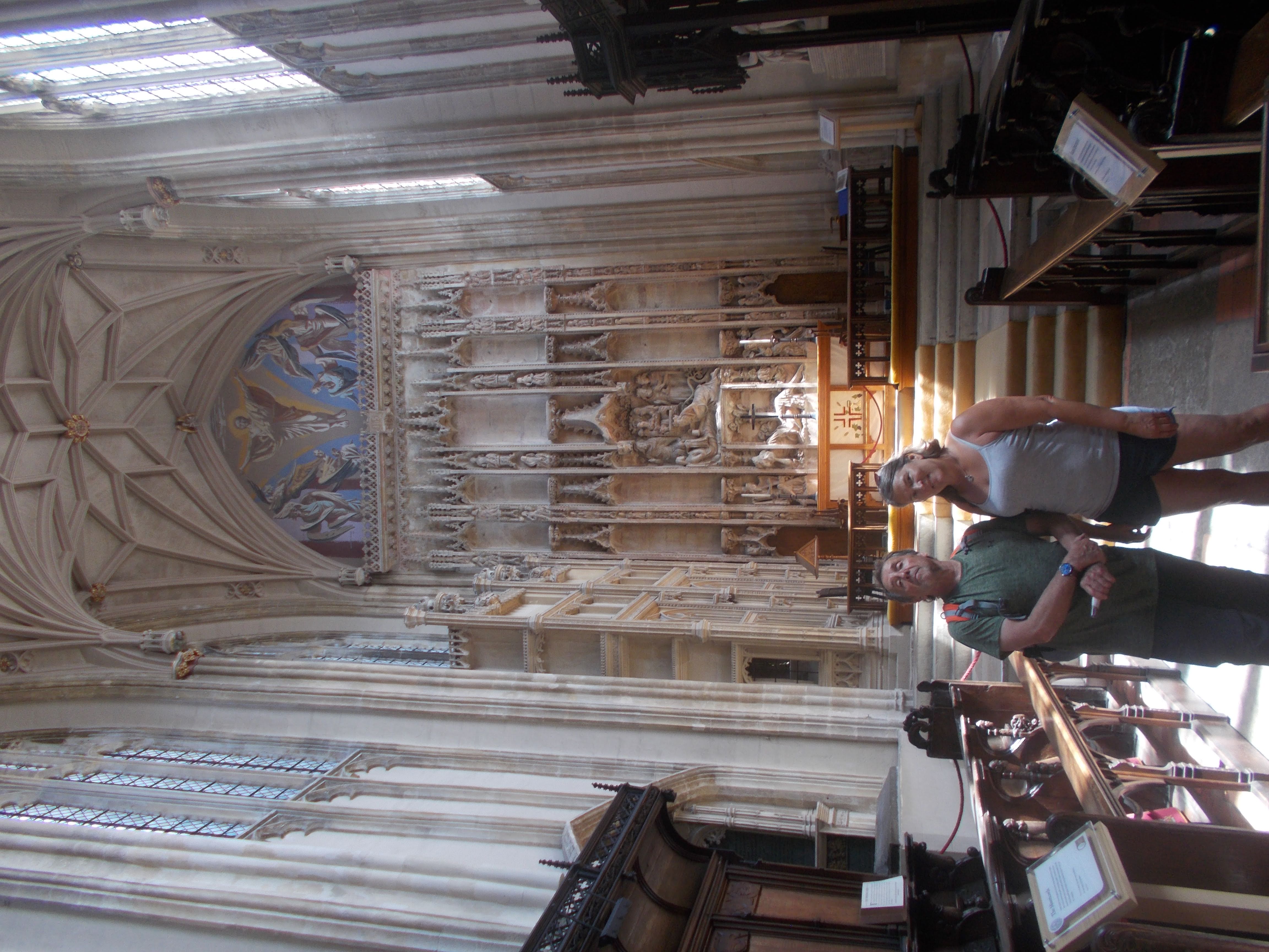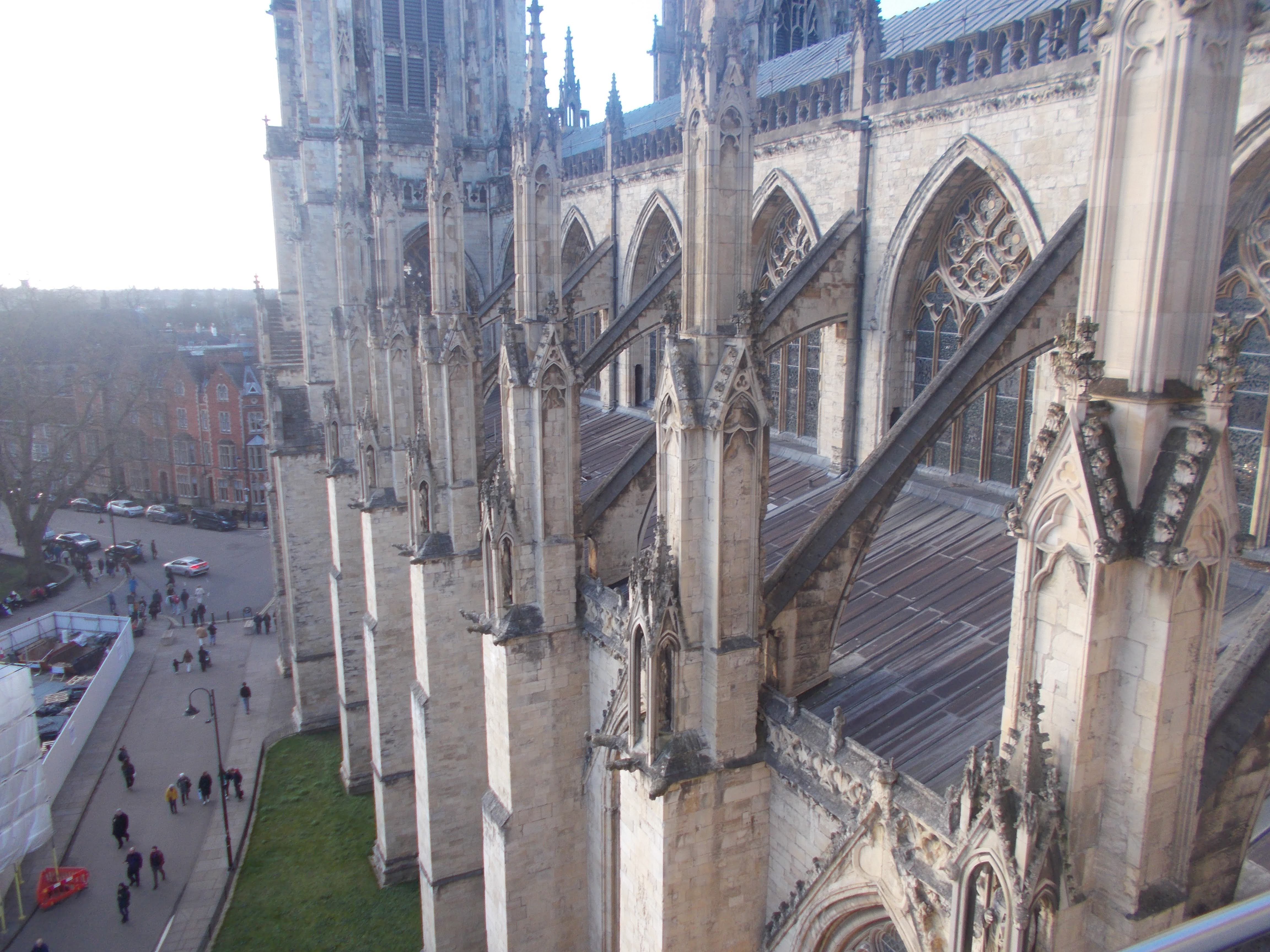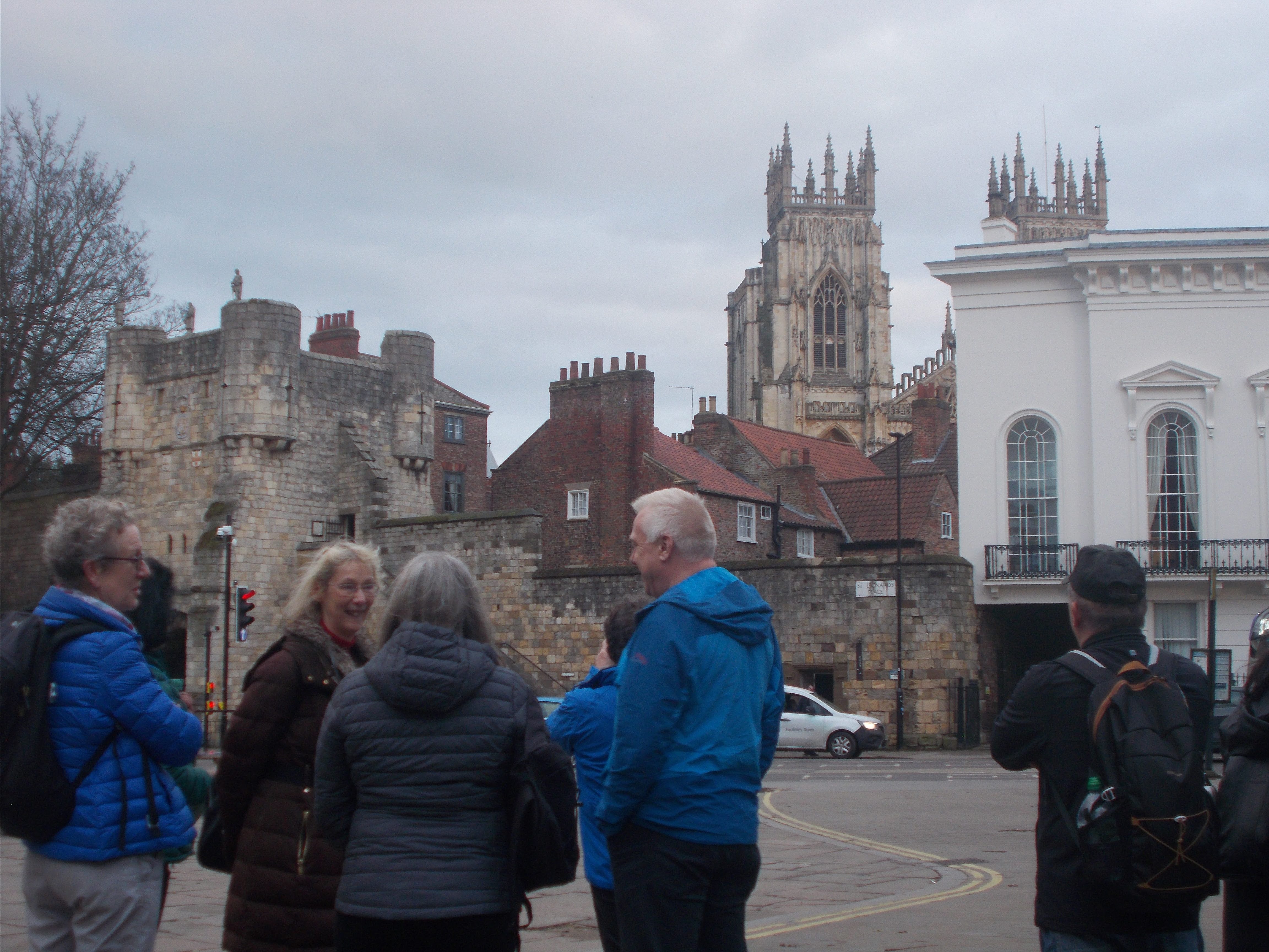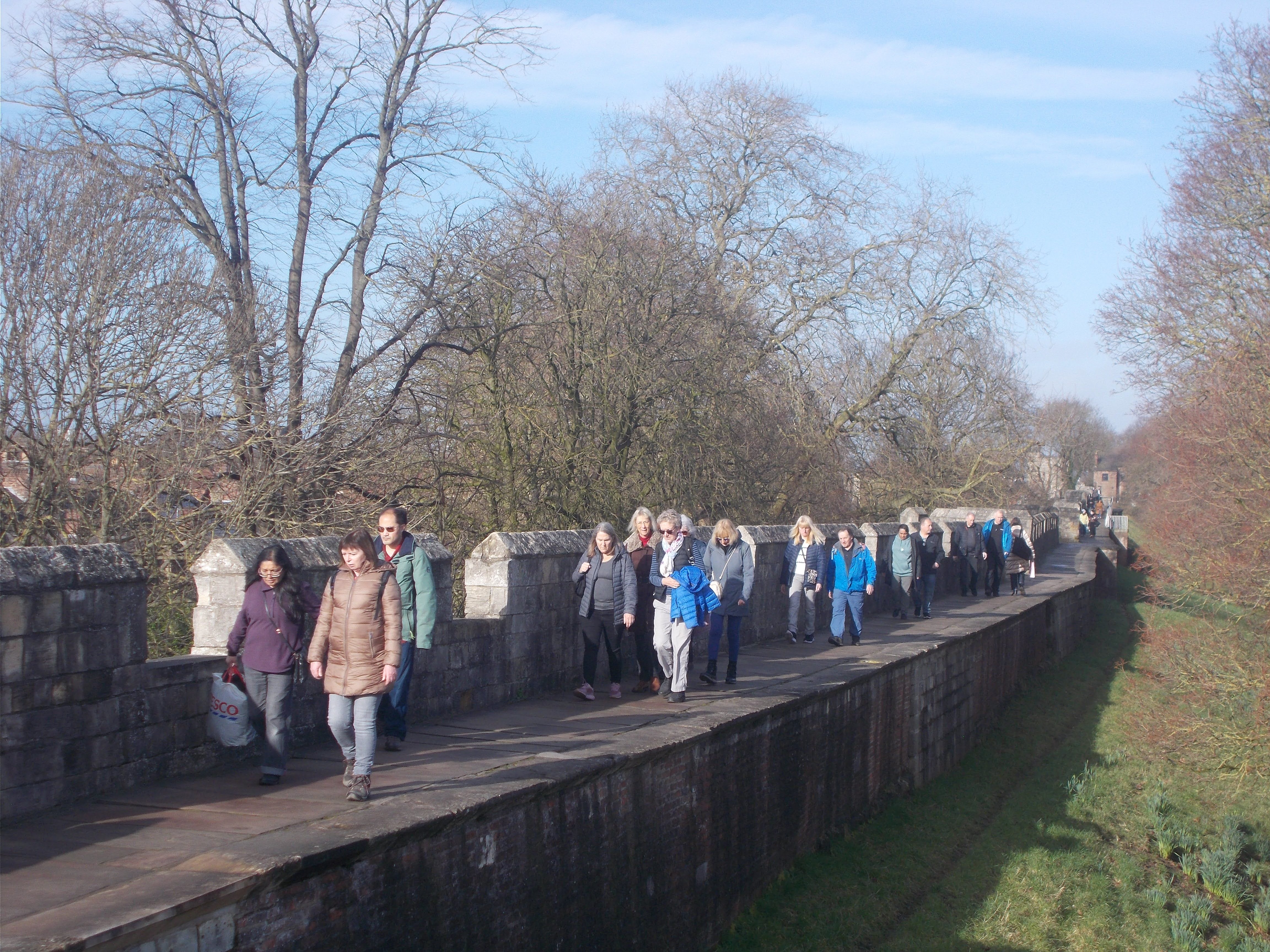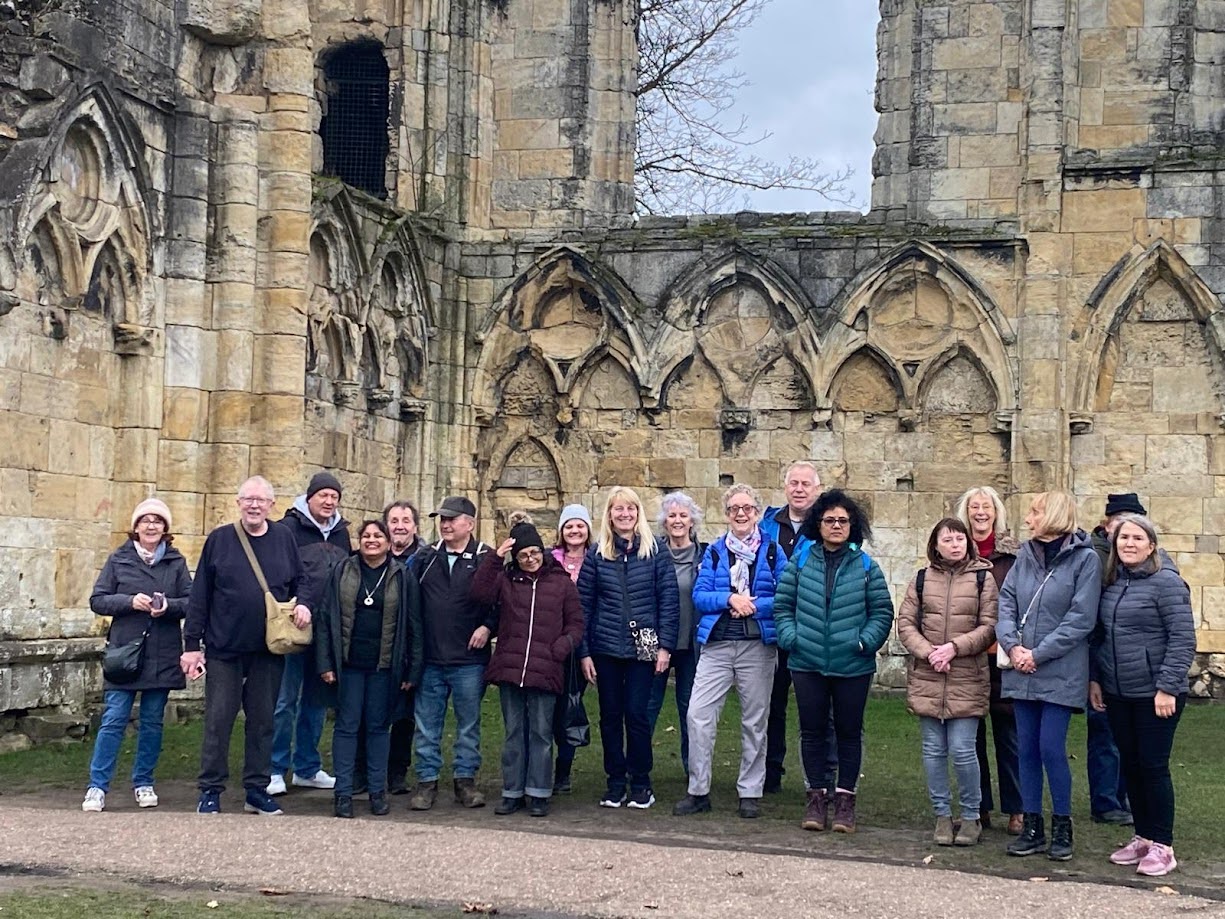 On Saturday we were up with the larks for the circumnavigation of the city on the city walls. York has almost its entire medieval walls intact, and the 3-mile circuit can be walked along the ramparts. As we stepped lively between the towers and gateways, we noticed lots of the towers had been repurposed as cafes. After exploring the Clifford Tower (remains of York Castle) we continued along the walls until Walmgate Bar where we happened upon a hidden tea shop within the Elizabethan tower. The former guard rooms now contain cosy sofas and artwork for a very different café setting. As we re-entered the old city, Judith befriended some Norse warriors, "I say you chaps, can one join in?". Judith was welcomed within the horned helmets and shields as they marched onwards. At the Merchant Adventurers Hall (original livery mansion from 14th century) we encountered more Vikings. We strolled through the Shambles (medieval alley with unique shopfronts) and made it to the Minster Square for the Viking Parade. Hundreds of lavishly attired Vikings assembled and marched forth across the city. Our next visit was to York Minster. This is the largest Gothic cathedral in northern Europe and has half the remaining medieval stained glass left in Britain. The guide explained the fascinating history of the Minster before some began the ascent of the tower. We were rewarded with stunning views over the entire Vale of York. We stopped for Parkin cake at the Minster Refectory before the majority returned to the hostel. Diane arranged an evening meal at the Door Mouse where Kevin and Malcolm enjoyed the traditional Yorkshire delicacy of the roast dinner inside a giant Yorkshire pudding. Just time to see the dazzling light show beamed on the main wall of the Minster and some live music at the Shambles micro-brewery pub.