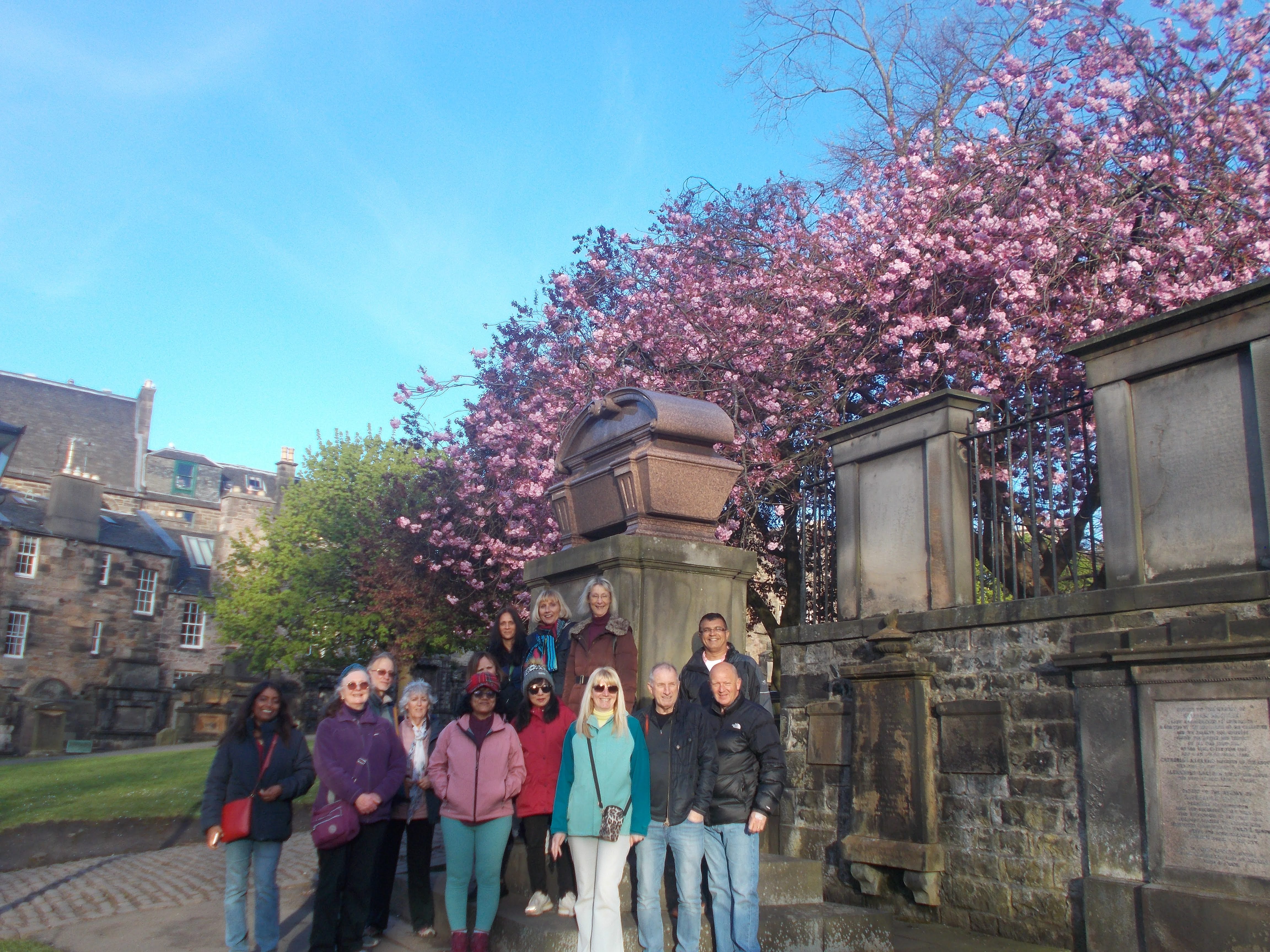 For our Easter Holiday in Edinburgh an eager thirty members took the express train to Waverley and our hostel by the Meadows. Our afternoon walk took in the avenues of cherry trees across the Meadows. Then to Greyfriars Bobby and the ancient Greyfriars Kirk and graveyard. Then onto the Grassmarket with gruesome tales of the execution point, Deacon Brodie (inspiration for Dr Jekyll and Mr Hyde) and the Covenanters. We stopped for fish and chips at Berties, with some ordering battered haggis for the first time. Late arrival Nick H explained his hostel was made up of "sleep studios", futuristic pods in a brave new world of piped music and unseen guests. We caught a folk session at the Last Drop Inn, with piano accordions accompanying the flutes and fiddles.
