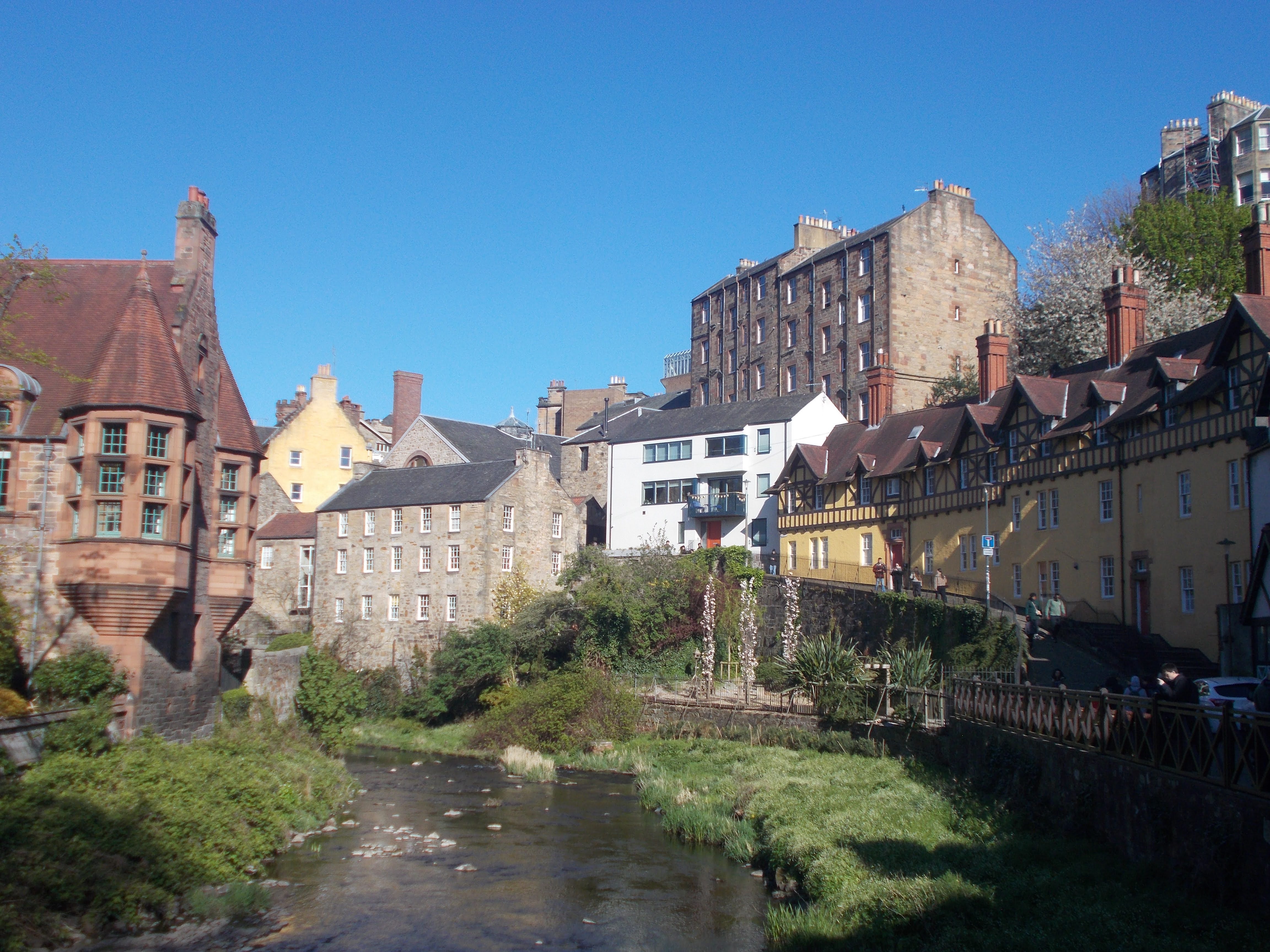 On Easter Sunday we jumped on the Edinburgh Tram (opened in 2014) for our journey to the harbour of Edinburgh, Leith. We alighted at the Royal Yacht Britannia, now moored there as a permanent exhibition. Britannia was decommissioned in 1997 after decades of royal service. The fascinating tour of the Yacht included the royal apartments, crew quarters and very pristine engine rooms. On the bridge we had a very smart high tea at the Royal Yacht tea rooms. We savoured our scones and took in the great views to Fife across the Firth of Forth. The afternoon walk was along the "Waters of Leith" trail back to the New Town. We passed blossom-filled trees on a very popular trail, walkers, cyclists and joggers enjoying the warm afternoon sunshine. At Stockbridge some stopped at a new book-themed café full of students before we arrived at Dean Village. This charming hidden quarter is a previously industrial suburb with the Scots Baronial buildings now refurbished and presenting a very colourful aspect above the babbling Leith River. Con departed for his nap before we assembled by the Tron Kirk for our Scottish-themed meal on the Royal Mile. Scottish menus never display calories so our meal included towering burgers, lots of haggis, black pudding and beef olives, with fried Mars bars for dessert. "I say, they're awfully nice" said Mark, ordering a second one. We saw another acoustic folk show at the Sandy Bells, before the last night party back at the hostel, Dean on the piano with Mike and Donna on guitar.