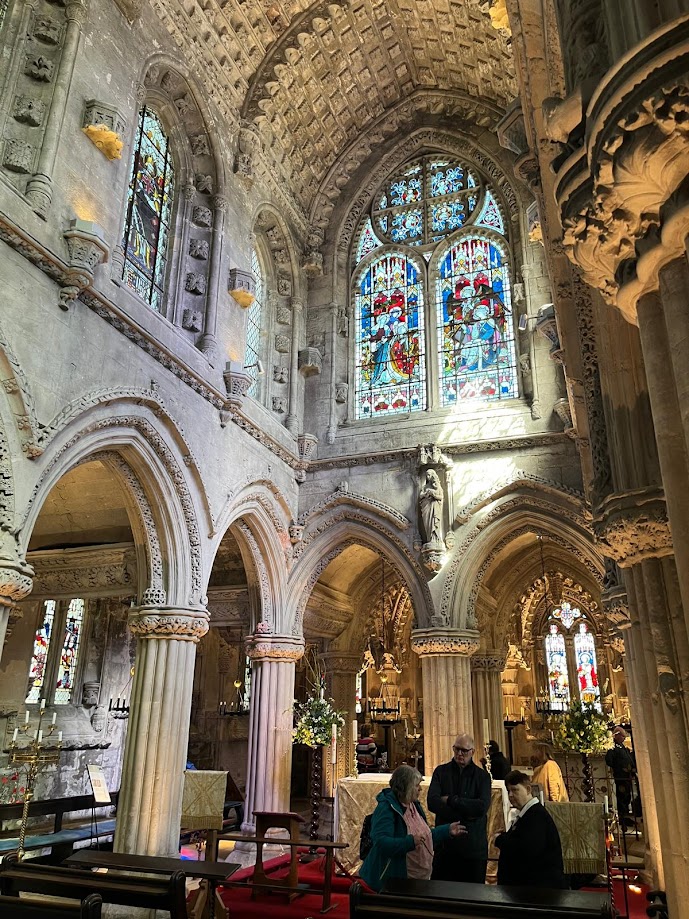 Easter Monday saw Nick G hosting departures at the Booking Hall 'Spoons at Waverley Station from dawn to late afternoon. Nick played the traditional Edinburgh game of having a pint when greeting each guest for the various departures. A few took the Lothian Bus to Rosslyn Chapel, which is one of most fascinating churches in the UK. Built in the 15th century it is full of mystery with purported links to the Knights Templar and freemasonry, and has the finest stone carvings in any church. Some explored Holyrood House Palace and Abbey, created by David I and transformed into a Stuart-era palace, full of history. Geetha and Sharon made it to Crammond and its unusual island. Mike and Cathy had problems with their packed suitcases of Abernethy biscuits, rare Japanese comestibles and worthwhile Scottish boardgames. The steward suggested using Eddie Stobart before Kerry rescued them by sharing the burden. Others visited the National Gallery, and Calton Hill and the National Monument with the Scottish Parthenon, copied from ancient Greece. Last departures met Nick G, still at the bar at the Booking Room, as we said farewell to the delightful city of Edinburgh after a very enjoyable Easter holiday.