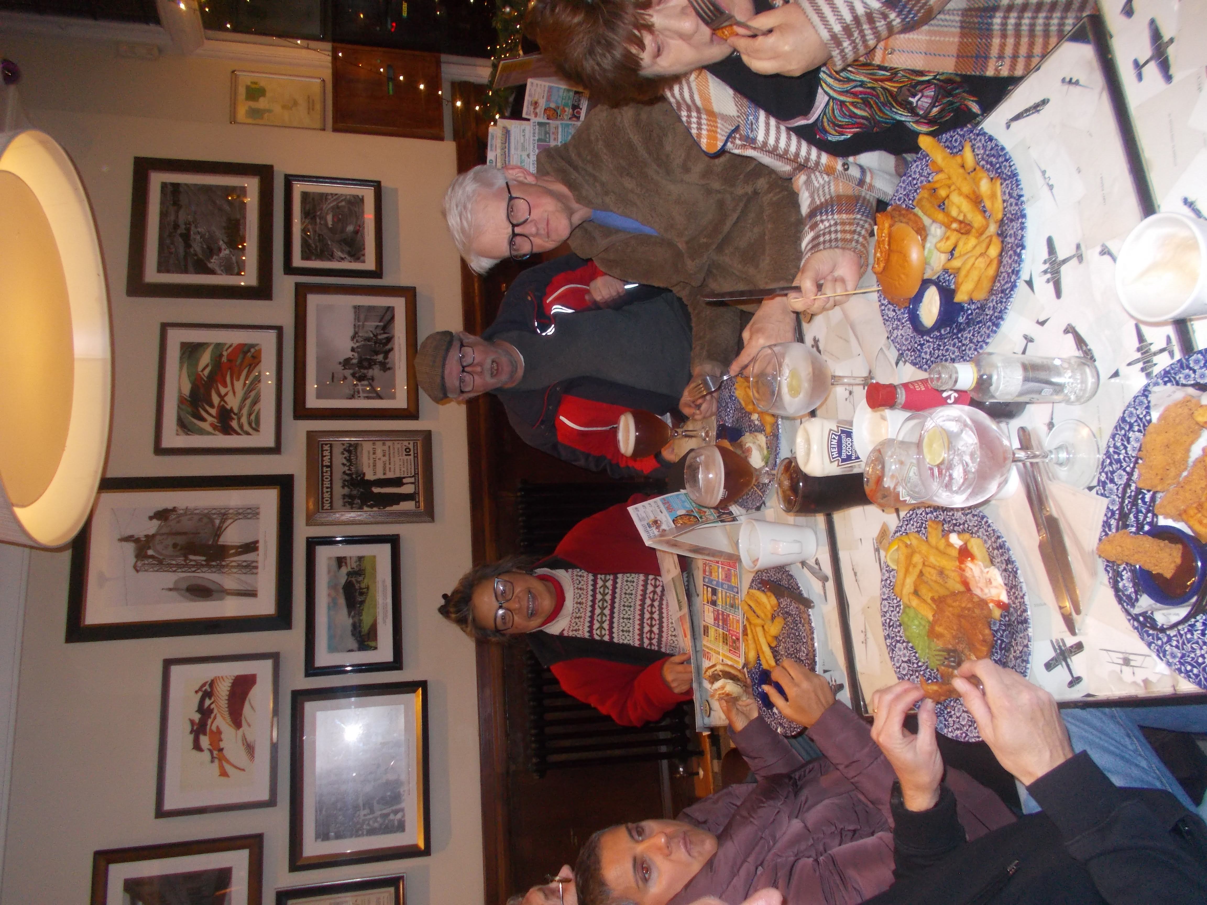 We met by the bike sheds where Con and Nick handed out the Old Holborn roll ups. "I've only started smoking to get me off vapes" said Dee, grabbing her second one. We then started the walk, taking in some impressive festive lights including inflatable Santas and reindeers atop a roof. "What's that elf doing?" asked a puzzled Prem. Kevin cleared up the mystery, "That's no elf, it's Jeff arriving late, as always". We then arrived back at the Greenwood for the Christmas meal. Ben the manager had reserved our private room thanks to Louise. There are many period photos of Northolt Racecourse in its 30s heyday, plus vintage LT posters on all walls. We tucked in to the meals and then reminisced about the many great holidays this year over some special winter ales.