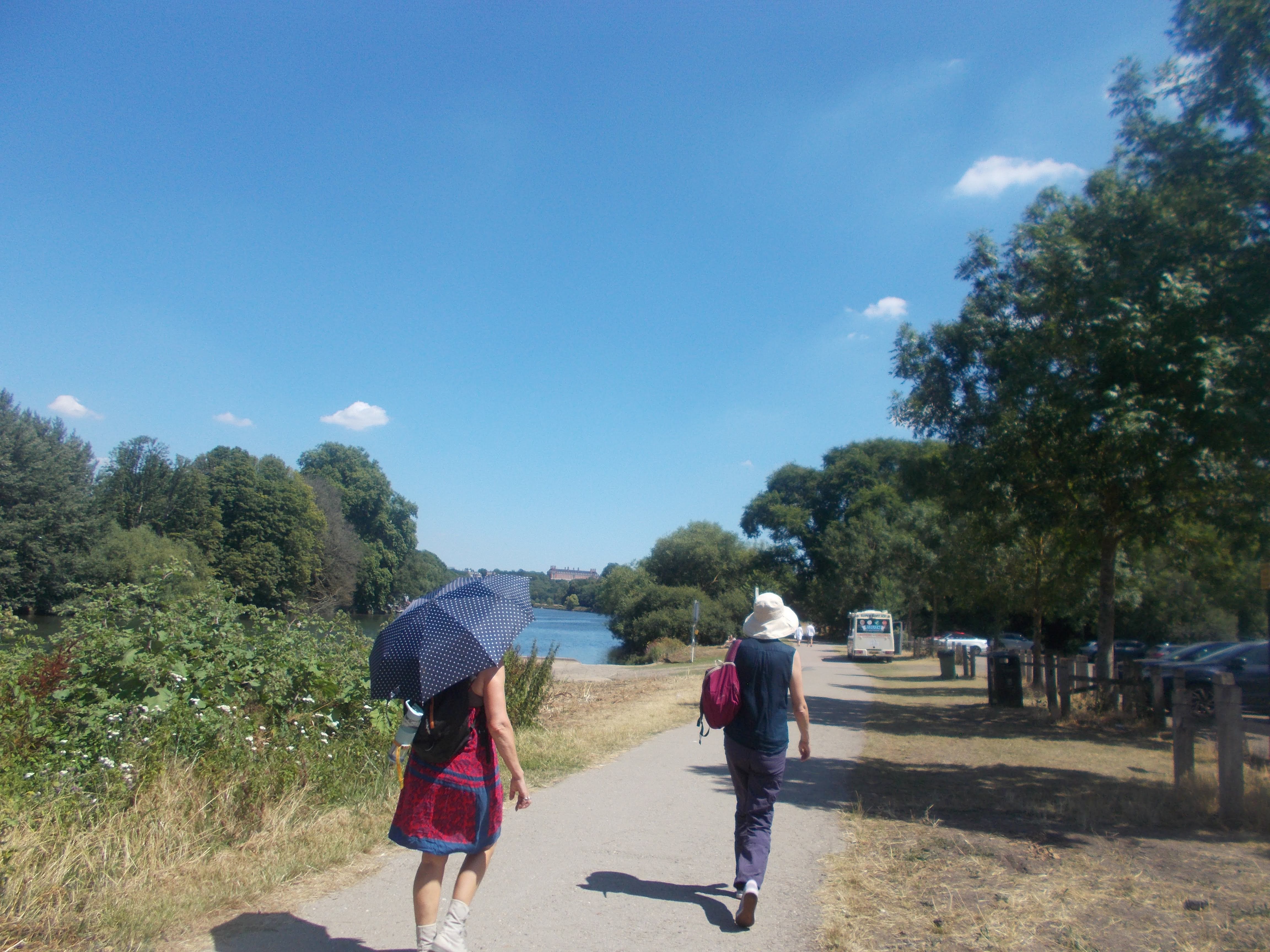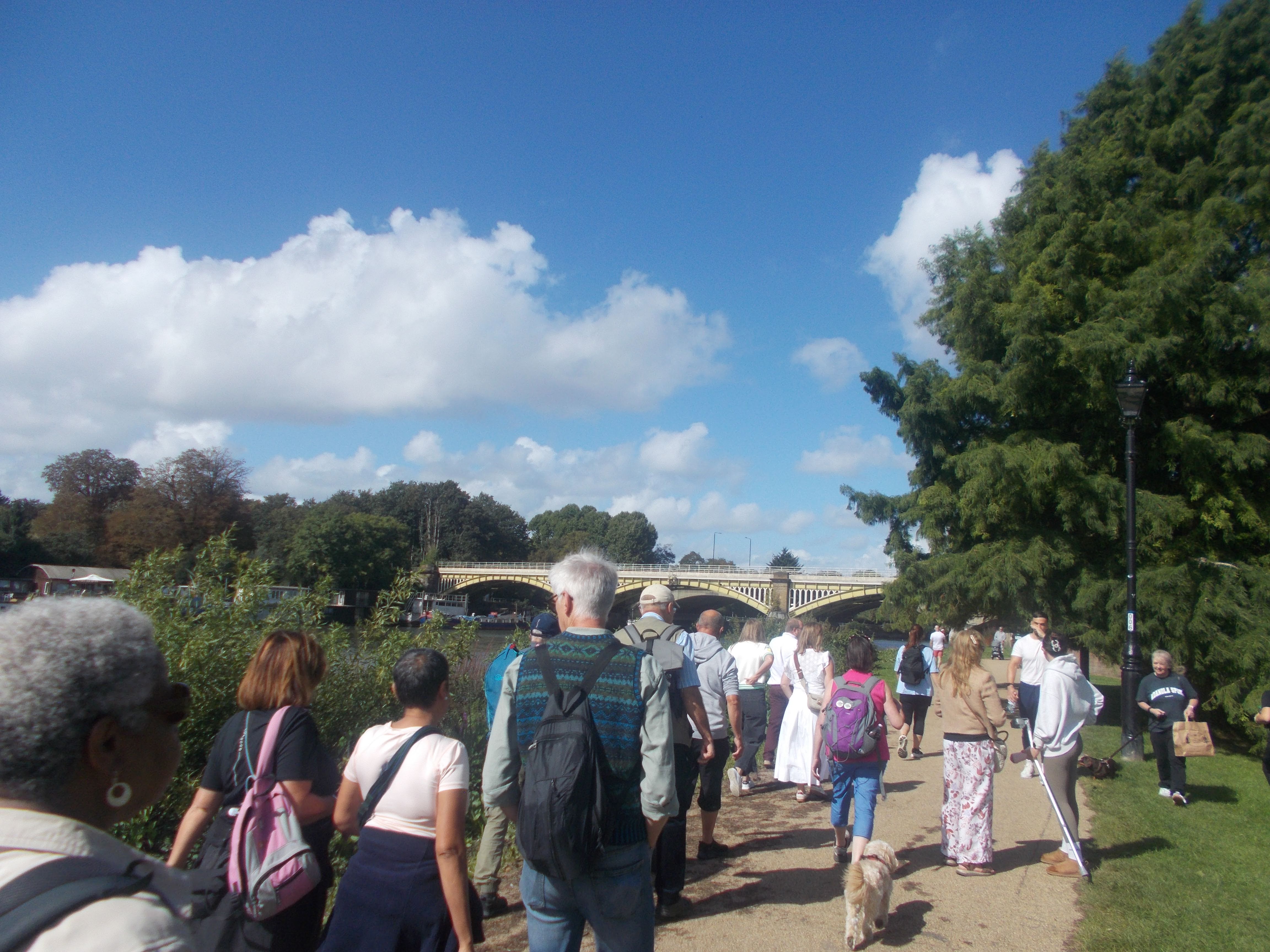 We set out on Sunday from Tide Tables cafe, Richmond Bridge. Initial 3 miles of towpath to Teddington Lock and Tide End pub - our first rest stop in glorious weather. Then onward into Bushy Park's woodland gardens for our picnic stop. Then to Hampton Court Palace - gardens open day - never fails to disappoint with show stoppers like the Great Vine (world's largest) and real tennis court - in continuous use for 600 years - yes. Henry VIII played there. Plus glorious palace facades. Then final 3 (warm) miles along the towpath to Kingston Bridge and the White Hart garden. Fabulous day in great company.