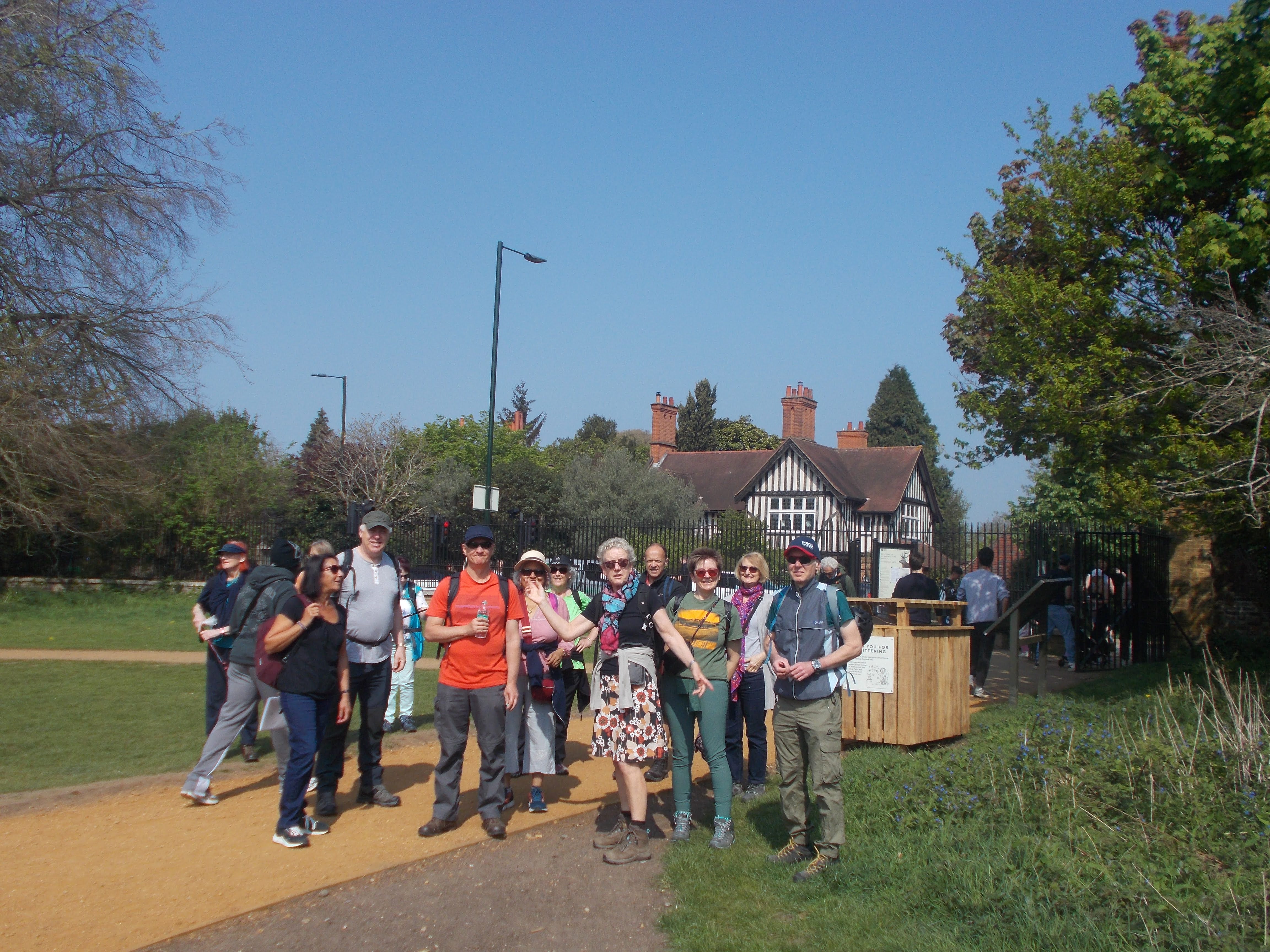 Our first evening walk of the season started and ended at the Queens Head (established in 1540) in Pinner. A record seventeen walkers followed the Pinner Association "10 walks around Pinner" guide north via the Grail Centre and the former village well. We continued through Metro-Land suburbs of Pinnerwood Park with rose gardens and manicured lawns. Then onwards to the lush meadows of Pinner Hill. We admired Pinner Hill House and the fine Victorian Pinner Hill Farm (very ornate timber and brickwork). Mi Faw and Luna took advantage of the empty countryside to race ahead on the trackway. We next climbed to the summit of Pinner Wood and the viewpoint from the Georgian Mansion of Pinner Wood House. Our route then descended south, passing several detached villas on the private roads of this secluded quarter. Kevin and Louise impressed us with local knowledge when pointing out former homes of Elton John and Bob Holness. The walk ended back at the Queens Head for well-earned refreshments and fascinating tales from Louis, Con and Mike about rock stars from the area.