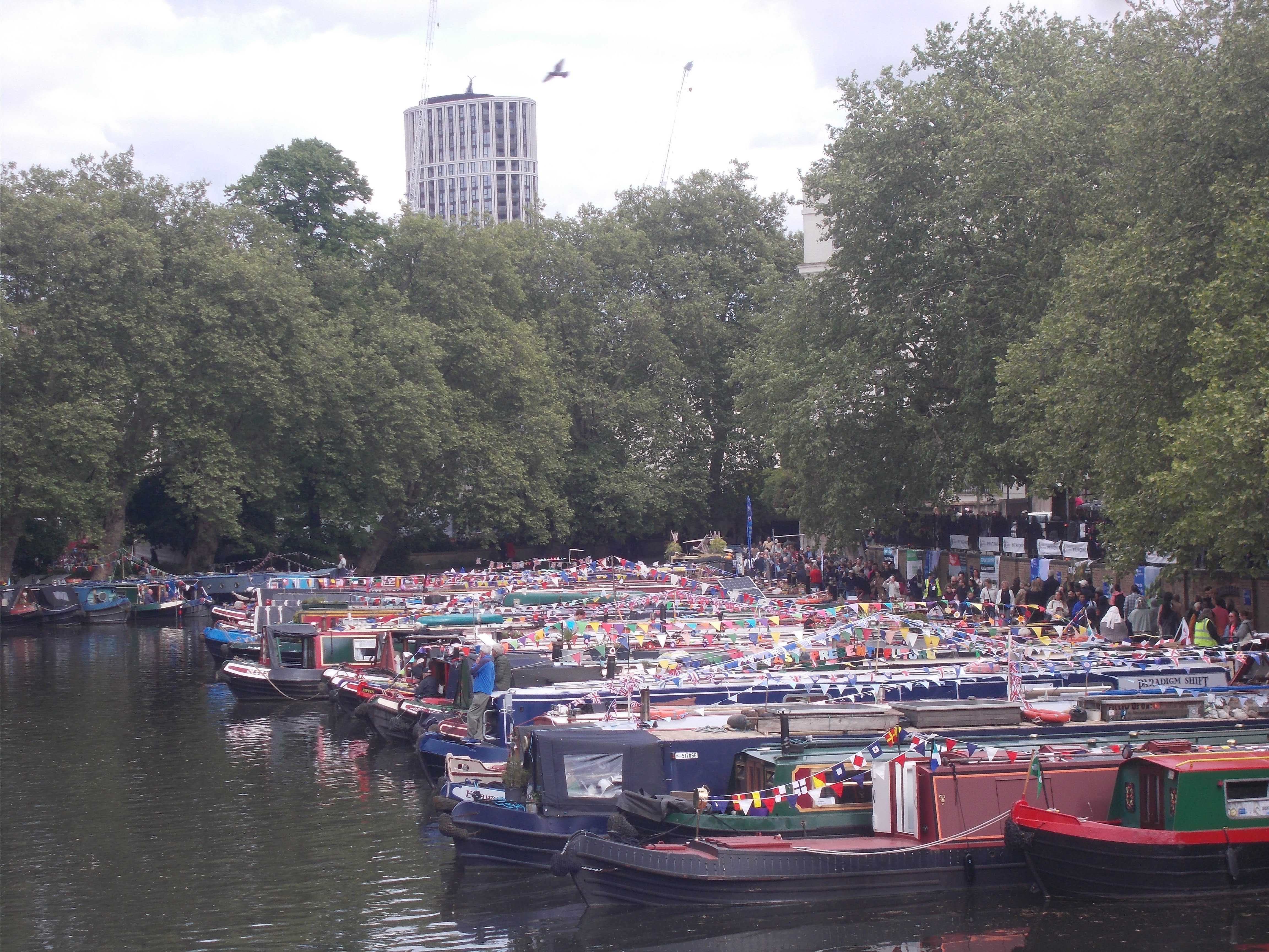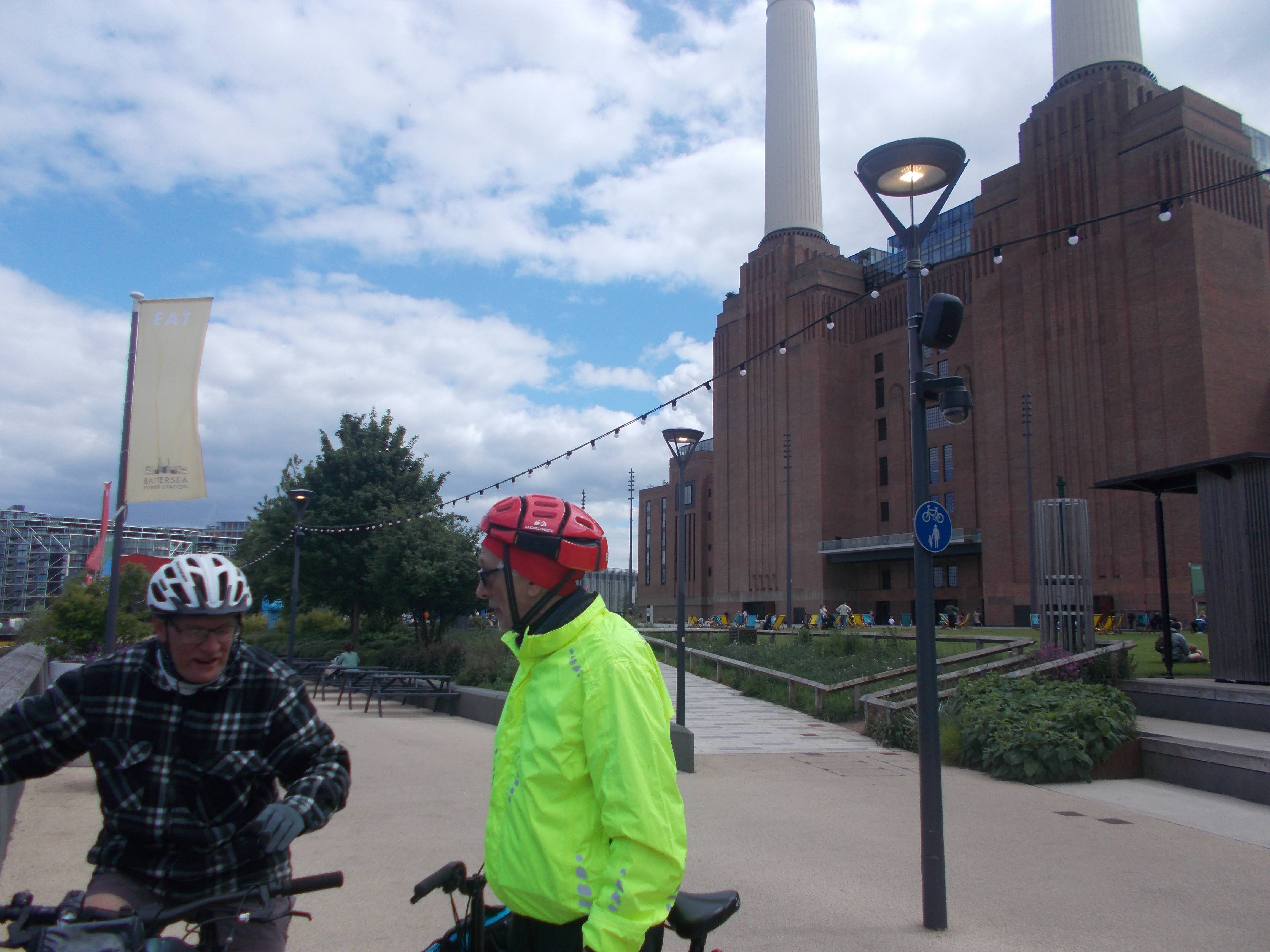 The ride continued along the Thames, passing the completed Lots Power Station redevelopment in Chelsea riverside. Then to Battersea Park and the Power Station. We then crossed the Thames to Westminster where all the stages were being set up for the VE celebrations. Vera Lynn songs were heard at the pop-up stalls as we headed into Hyde Park. Tiffin at the Italian Gardens, lots of families picnicking in the sunshine. The ride ended in Little Venice where the Canal Cavalcade was very popular, a vast flotilla of decorated canal narrowboats with music stands and stalls surrounding the charming Little Venice basin.