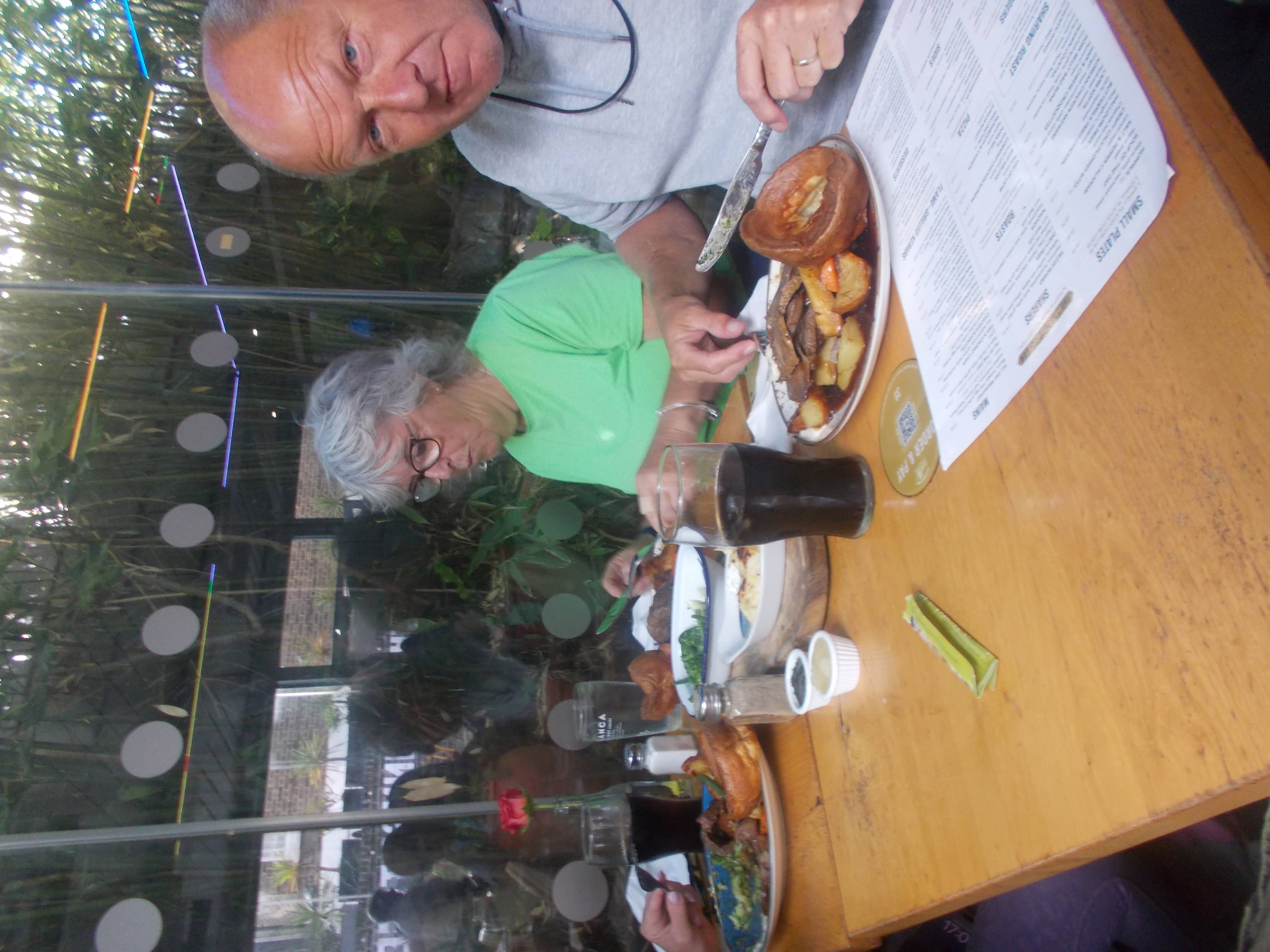 We admired the artwork on display before enjoying some rather splendid cakes at this unique church. Peter entertained art lovers with stories of the Blitz in Neasden. Next stop was Johnsons Island, an artistic haven reached via a narrow alley and footbridge. It was a very rare chance to explore this delightful island, full of artist huts and cabins all linked by hidden passageways and precariously narrow and steep spiral stairs. We were offered Japanese liquor wine at the hat studios; "it's awfully nice" exclaimed Rob. The riverside was packed with festival goers and locals dining on the terrace cafes on such a sunny day. Passing the boat yards, we happened upon another walking group led by Kevin (former member and Elton Tribute Act). "Where's Con", asked Kevin, "still recovering?". We all nodded as Kevin introduced our group to his troops. We visited Georgian Mansions, the Musical Museum and several other venues on the walk eastwards. In Watermans Park, Louise announced, "It's Yorkshire Pudding Time". "Just the ticket" we responded. So off to the Express tavern (railway inn with Victorian interiors) for a sumptuous Sunday Roast after a jolly fine day on the river.