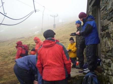 The Saturday began with a steep climb to near the top of Helvellyn, with compass and navigation exercises on the way up and also being made aware of changing weather conditions. It was a typical summer day (his words) with winds at 30mph and heavy rain with visibility down to 60 yards and about 6 degrees C. Our final destination was to be near a ski lift/shelter, where luckily there was a patch of snow on a slope which was large enough for us to practice on. We carried out ice axe arrest exercises which involved sliding down the snow slope, on your front, back and upside down and using the ice axe (pointed end) to stop your fall. This proved to be great fun for all. Somehow I managed to get this wrong by panicking on the way down and jamming in the handle end of the axe which flipped me over...ouch! Some learn the hard way. We also practised walking methods in the snow and using the spiky foot crampons. We had talks in the evening which covered avalanches and testing for avalanche conditions, and also on hypothermia.