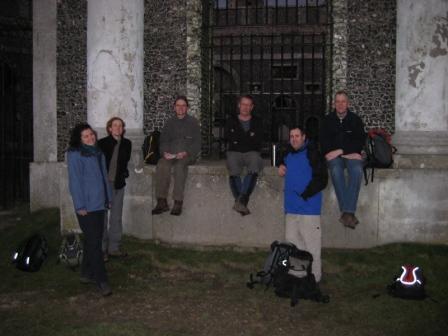 Six of us were at the start point early, before 7.45am, and thinking that was it, we headed up the West Wycombe Hill. Half way up a screeching car and a yell announced Emma had arrived and we were to be seven. At the top of the hill we could see a collage of colours: ahead, red sky, blue sky, white cloud, yellow and orange beams, and behind us in the distance, the disappearing dark of the past night. And just before official sunrise (08:07) Steve N arrived, taking us to eight.