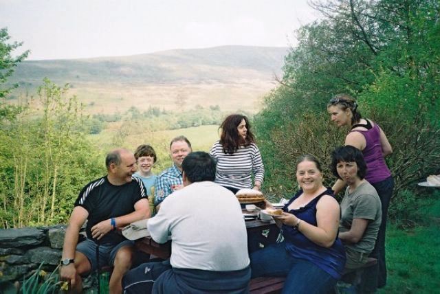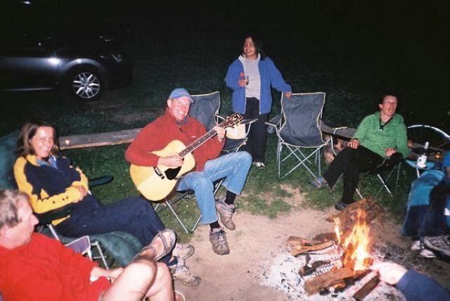 Dinner ensued with Mick and Humay helping set the table, and excellent washers-up Tim, Steve and Mike, showing keenness and willingness beyond duty. Evening brought out Brian F's guitar, and Mark "women wear these bras, but men don't bother with them", provided some special entertainment, by bringing new friends Magda and Gary along for the night for a singsong, before they had to fly off. Jan got a stick of rock as a present to remember the weekend. It brought tears to her eyes as she'd never seen one as big as that before. Humay and Jane attempted to rival the scouts who had been there before us, by creating a HAWOG poster to adorn the spaces on the walls. There weren't enough Quality Street wrappers to manage this though, so we had to make do with a HAWOG leaflet. Mike got the campfire blazing, as we all sang along to 'Magic Moments, filled with love'. Jeff became very emotional at memories of jamborees past.