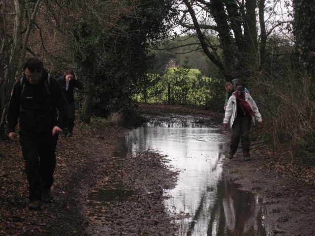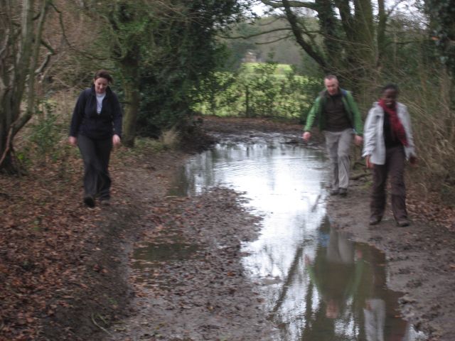 The scenery at this time of year is very bleak and bare, hence Derek's fascination with my wooly hat produced some interesting close ups of the aforementioned item. Apart from some colourful red plants and flowering willows, there was not much in terms of flora a and fauna. The Hartsbourne stream made sure our boots were tested for water resistance, trudging through plenty of soggy mud. Left the Paddingstone Cairn, a pile of rocks for directional purposes, to our right and made our way to the next stile. A lazy wind along open exposed areas went right through us (not around).