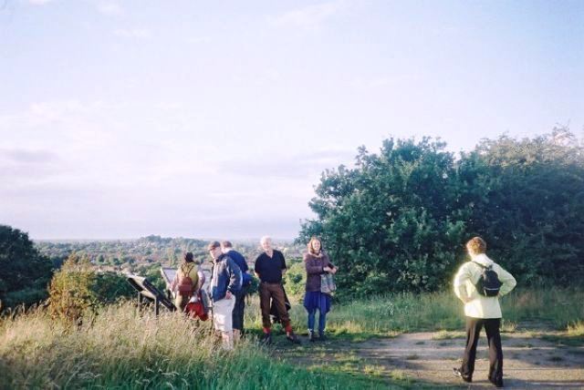 An inviting route along the canal led us to Trout Lane from where we could observe beautiful fishing reservoirs, until a bailiff kindly redirected us out of the private property I had led us into. Back onto the Beeches Way, and soon we were relaxing once again. As a complete contrast to the serene canal, we crossed a footbridge over the M25 which would test anyone suffering from vertigo and as Phil explained, would cause any sufferer to grip the railings in case they fell over the edge. On the contrary, Neil explained how much he liked the crossing, as well as how good it was to get away from Camden for a complete change of scene. Marvellous! As we passed Iver and came to Love Green, the romantic rural scenery took hold and the horizon opened out for us at Langley Park where we enjoyed a tea break.