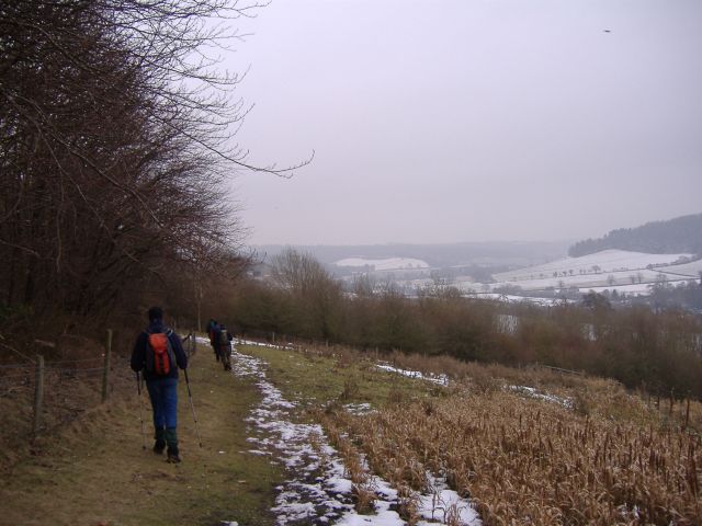 The starting point for this walk was a mobile network black spot (never checked!) so only fourteen of us managed to find the start point on the first Sunday of 2012, a cold bright morning (apologies to Mary). This walk took us through woodland (with a bit of navigational help from Mike D), round an iron age hill fort (Cholesbury Camp) which dated from about 300BC where we detoured into St Lawrences Church and examined the interesting assortment of unusual headstones. Our walk continued along the base of the valley much to Mike and Phil's disappointment, so to take advantage of the clear day with fine views we deviated from the plan to climb up and walk along the elevated ridge.