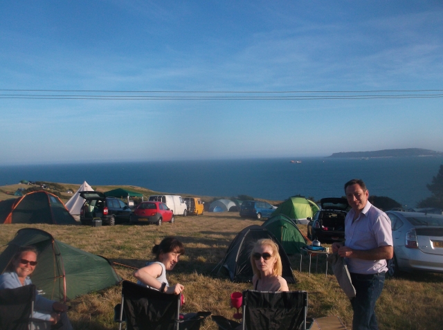 18 of us made it to Dorset for the 5th camping trip of this great summer of camping. It was another scorchio weekend at Shortlake Farm which has an amazing location, sloping downhill to the Jurassic coast affording wonderful views out to sea and towards the isle of Portland. On arrival the organic farm shop sold cooling ice creams to enjoy whilst we set up camp. New converts to camping Sandra, Rob and Paul opened up the wine to welcome in new campers Louise, Mark and Kevin. Rubin and Amber had great fun with the swing ball game with Bobbie racing around to catch the ball. Nick demonstrated his rotating barbecue prowess whilst some others dined at the famous Smugglers Inn in Osmington reached via the coastal footpath. Later Dean with his trusty chopper was in charge of the camp fire.