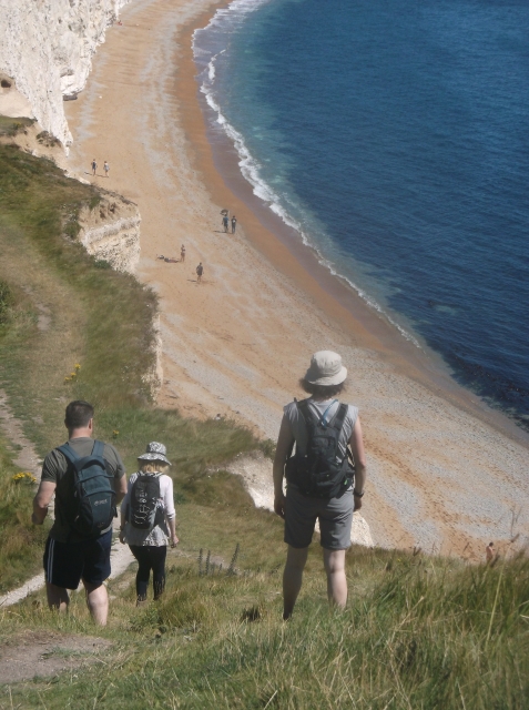 On Saturday we were able to collect fresh pastries from the camp bakery for breakfast in the sun enjoying the great views out to sea. Brian led the main group on the linear walk eastwards following the SW coastal footpath. The clear blue skies allowed great views all day. Our route involved some tough climbs with a break at the hidden Ringstead Bay beach. We found a picnic spot at White Nothe point; high on the cliff top we had panoramic views east to Lulworth and west towards Dorset in the far distance. Harpreet spotted the iridescent green beetles which hover over the flowers along this coast. The afternoon route involved several big climbs and vertiginous descents looking down on secluded beaches far below with several yachts harbouring just out to sea. As the day was so fine quite a few of the group descended to the beach to sunbathe by Durdle Dor before ending at the beer garden in Lulworth for cooling drinks.