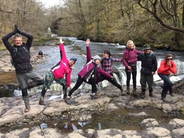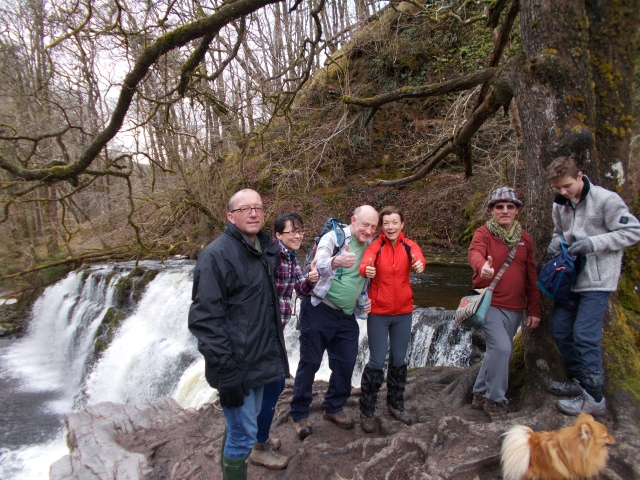 Friday began with a promise of fair weather so we set off for the first waterfalls walk. The stunning array of different types and size was amazing. A hidden waterfall was discovered by a breakaway group who later arrived at Sgwd Eira to discover that the waterfall was too torrential to walk under. The leading group headed back while the breakaways carried on down where young Laurence decided to take a first attempt at the falls. He reported back that there was a path behind it so we were able to stick to the plan and carry on the other side to Pontnedfecchan. After passing Dinas Rock we headed into town where the first pub didn't allow dogs. Luckily we found a better one that did. Later the others joined us along with Rob and Sandra that had travelled up that day. The rain then came as we settled in for late afternoon refreshments. Back at the bunkhouse with Rob and Sandra settled in the Shepherds Hut with welcome hamper provided by the owner. Another night of relaxing and tired heads.