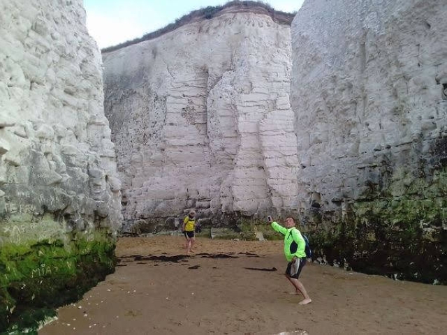 On Saturday we awoke to glorious blue skies and breakfast cooked by Gilly and Martina. We set off on the long coastal cycle ride from Deal to North Foreland (Botany Bay). The sunny weather meant that all the beaches and resorts along the coast were lively. Sustrans route 1 was well signposted; we stopped at Pegwell Bay for the Viking ship and the beach café. Climbing to Ramsgate the views over the yachting marina were stunning, the clear skies also affording the coast of France (25 miles away) to be easily visible. Arrival at Broadstairs we had to park the bikes as the town was choc-full for the annual folk festival. Bands were performing at the bandstand, the promenade walk and in the terrace gardens. We had our picnic on the beach whilst Daniel took over some sand castles kindly prepared by other children. Leo led Gilly and Coogee on an extended ride taking in the very scenic Botany Bay with its imposing chalk stacks and white cliffs. The intrepid trio undertook some cave exploration and beach games before cycling back to camp. We had a very late barbecue (long story) with the campfire roaring into the early hours.