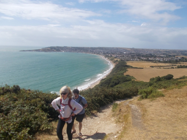 After the kitchen crew directed by Martina and Humay cooked up a storm for 23 people, Saturday brought sensational weather and an exciting bus journey. Jacquie managed to find us despite risking coming later and campervan Anne recruited a potential new member from the bus at Durdle Door, who stayed for lunch. We oohed and ahhed over the gorgeous sight of Lulworth Cove and Durdle Door and walked into the glorious sun to meet the campers at White Nothe. Tea stop and pub swiftly followed and Natalie surprised us all by arranging an impromptu party at the Smugglers Inn. We meandered home with smiles and managed to keep Jeff in sight all the way, no mean feat. Sisters Susie and Jennifer regaled us with tales of home before most of us went for a well earned pie. We met up with the intrepid geo-cachers, who left no stone unturned in their 8 mile scramble for treasure. Kim passed her novice badge and was awarded by Martina with a trackable. Music from the festival sent us to sleep.