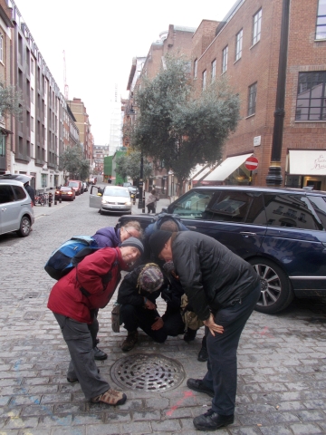 Not to be fazed we headed on to Brook Street where we were drawn to a grate in the centre. This was our first discovery of our brook right in central London. Chris provided a torch and we could all see the water rushing beneath. The stream has actually defined many boundaries. We find one in Bruton Lane with a stone plaque. The stream exits Mayfair via Shepherds Market, where the original May Fair was conducted on its banks. From here we enter Green Park and now the course is clear thanks to the King's Scholar Sewer which runs directly beneath Buckingham Palace. Through Pimlico, much of the Tyburn flows beneath the wide and winding Tachbrook Street. At the end the course dives beneath a housing estate and reappears just in time to join the Thames. The obligatory pictures were taken by the plaque, reminding us of our journey with a legend of place names, then across the road to the Grosvenor pub for gruel and grog.