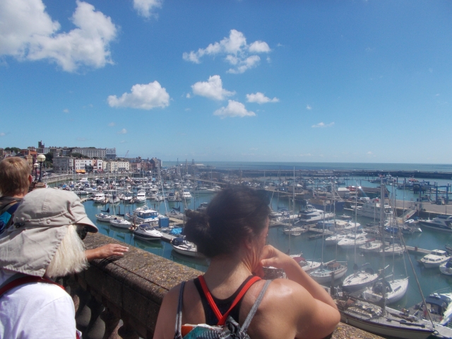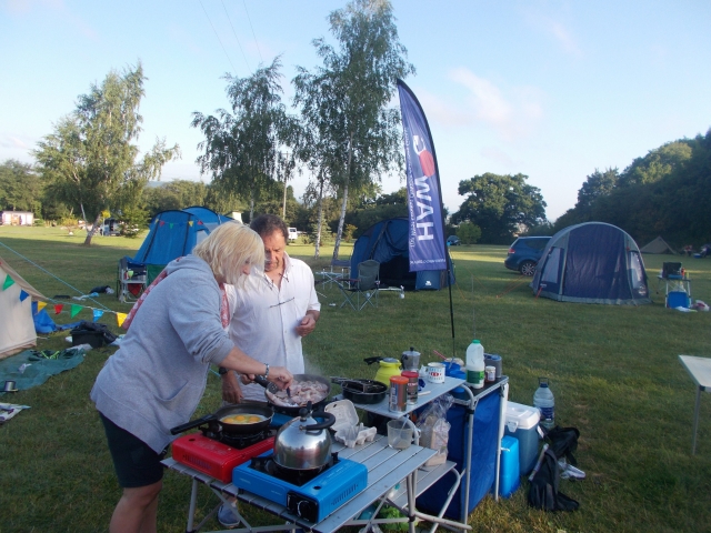 The early morning blazing sun and Tony Blackburn awoke us early for mugs of tea and bacon sarnies. Malcolm set off on his marathon cycle ride, from Sandwich to north Kent and back along the Viking Trail. The others did the walk from Pegwell Bay to Broadstairs along the coastal path. This route is mainly on the clifftop with panoramic views throughout. As the blue sky was so clear France was easily seen as well as the wind farms out to sea. We stopped for cooling drinks at the Edwardian Royal Pavilion at Ramsgate, finding tables on the balcony terrace looking down over the sandy beach and the yacht marina. The route continued north until we descended to Dumpton Bay for ice creams on the beach. At Broadstairs the Viking Bay beach was crowded with sun bathers and swimmers. After drinks at a beach bar we headed back to site. Diane, Rachael and Jan prepared a sumptuous barbecue before Daniel received his birthday cake. Around the campfire Coogee once again provided the music on his ukulele with Jan, Martina and Diane leading a rousing version of "You've lost that loving feeling".