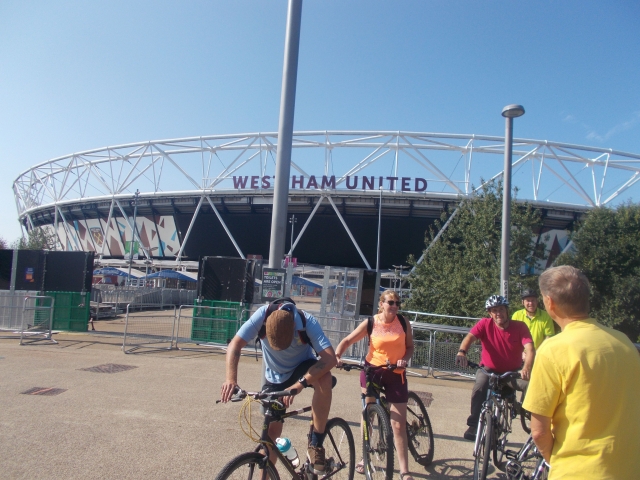 Superb September sunshine saw seven sweltering cyclists sauntering south on Sunday. Meeting at the Unity Kitchen Cafe in the Olympic village, we exchanged various stories regarding our journeys to the start point and met newbie Ed from Meetup. We had a call from Tim who found the ice cream truck outside the West Ham United ground, so we left the cafe and went to meet him.