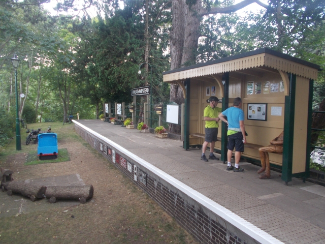 Five cyclists met on another fine sunny morning at Hampstead Heath for our cultural cycle ride. The Heath was busy with walkers, cyclists, joggers and one lady trailing two huge tyres behind her; "I'm training for an Antarctic Trek" she explained. We climbed to Parliament Hill for views over central London, lots of kites being flown on the summit. We crossed the Heath, via the various Ponds, and continued into Highgate. Another climb to the village centre, pausing to see the home of Coleridge and Priestley. Onto Highpoint, the modernist creation of Lubetkin, generating some architectural criticism from Kerry. A detour then to discover the "lost former Highgate Station". Climbing up the car park wall we succeeded, good views of the original platforms and buildings recently featured in Tim D's railway programme. We then joined the Parkland Walk, a converted railway line (Alexandra Palace to Finsbury Park). This is an excellent traffic free route including the old platforms, bat caves, sculptures and views of the districts below. At Finsbury Park we had lunch at the park café by the boating lake. It was a popular spot for birthday parties, Mark and Dean entertaining them with amusing anecdotes.