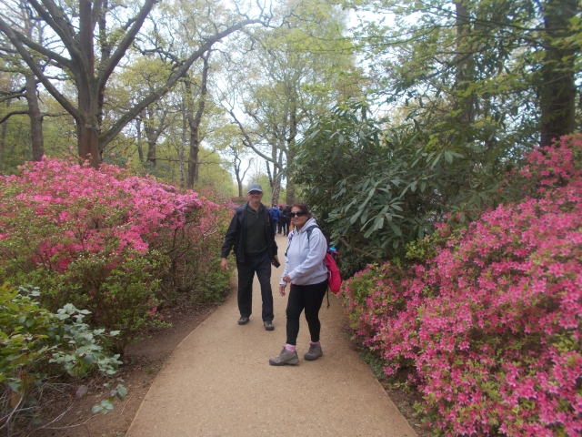 A mixture of newbies, regulars and surprise guests met at Tide Tables cafandeacute; terrace by Richmond Bridge. Rob W and Mona were passing through and chatted to us over coffee and pastries. Our route followed the Thames Path to Petersham Village. We admired the many mansions in this historic hamlet, including the corner villa reputedly that of Tommy Steele. Into Richmond Park we climbed to Pembroke Lodge (lots of Fallow Deer on the ascent). We climbed King Henrys Mount to view St Pauls through the telescope and took in great views over the Thames Valley. Mona's date cake was shared out as we took in the vibrant display of tulips. Rob P guided us through the park to reach Isabella Plantation. We strolled around the kaleidoscopic display of azaleas on display in this delightful enclosure; pink, red and purple were the dominant colours. We had our picnic by the lake, Carole and David explaining the history of the park and its features.
