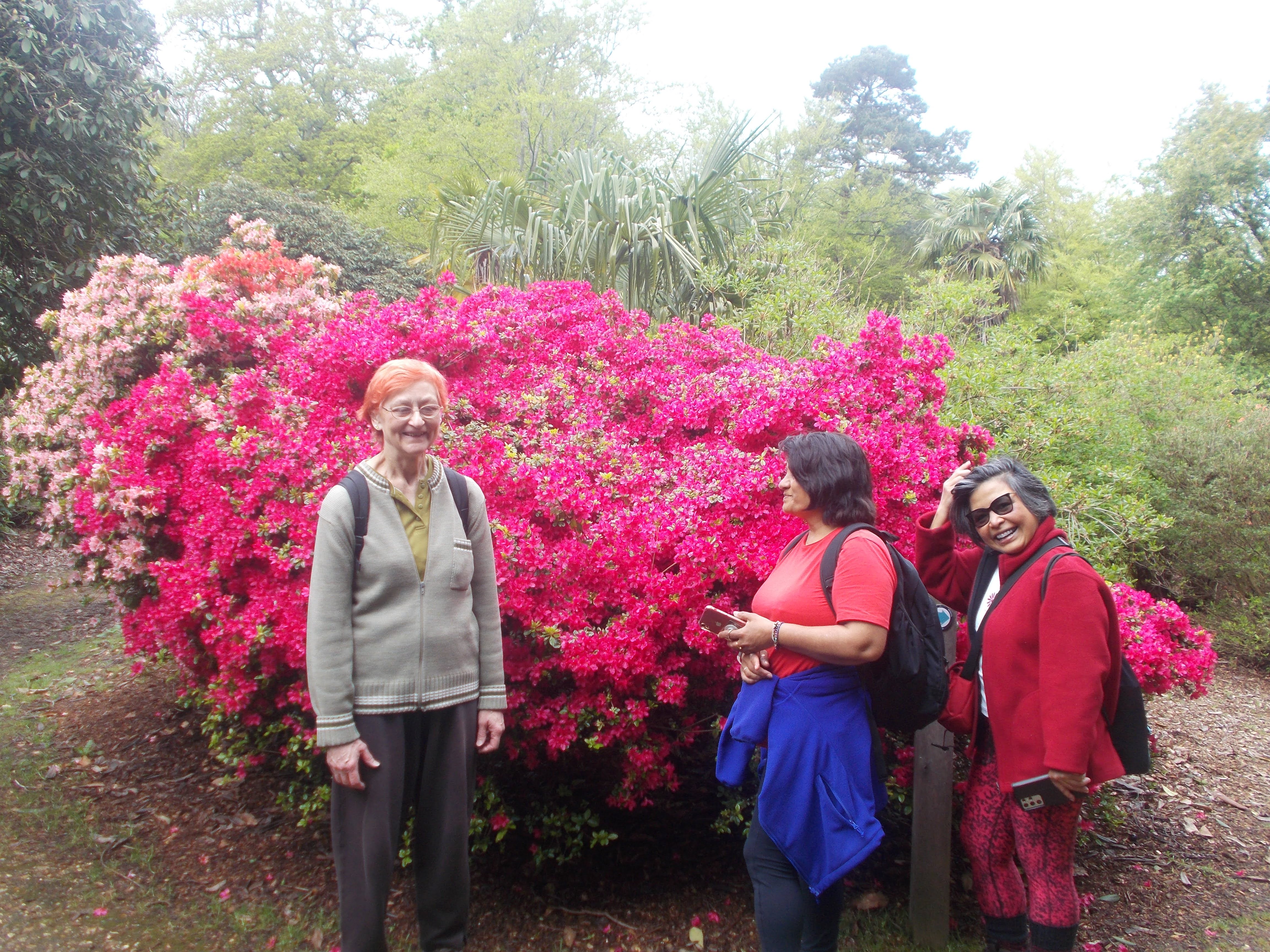 Bentley Priory has a number of ancient woods. Growing there are hornbeam, midland and common hawthorn, birch, cedars, yew, and odd patches of laurel, and rhododendron. We waded through muddy ground in search of the master oak tree, the oldest tree in Middlesex. At one point, I thought it had moved! At last we located it and were all so appreciative to see close up this amazing master oak tree. Many photos were taken there. The tree is near a beautiful large pond. We headed through muddy woodland until we got to the lane leading down to the deer park and had our group picture taken.