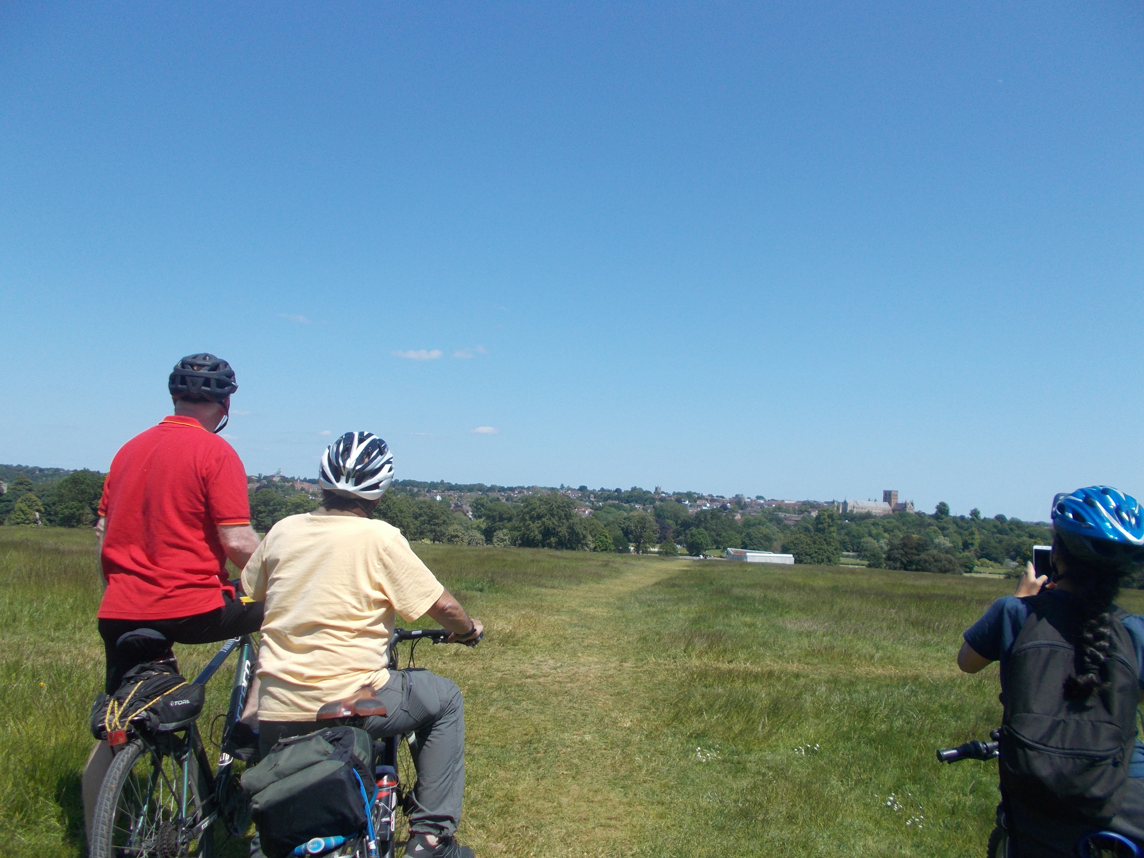 Five eager cyclists met at the Rusty Bike Café for coffee and cheese toasties. Our ride was an easy 20-mile ride from Uxbridge to Burnham via Eton. We followed Sustrans route 61 via the Grand Union Canal and tracks through Langley. En route we passed several pillboxes and aqueducts on the Slough arm and some herons gliding by on the water. We crossed the Jubilee River via the timber footbridge and entered Eton College playing fields. We explored the charming riverside town and then joined Sustrans route 4 west. Our next stop was Boveney village to visit the 12th century church and medieval manor. Detour around the Eton College rowing lake as riverside entrance closed. Then to Dorney Court, with its manorial buildings and church, often used as a film location. Then late lunch at the Pineapple, ginormous sandwiches for all and a fitting end to the ride.