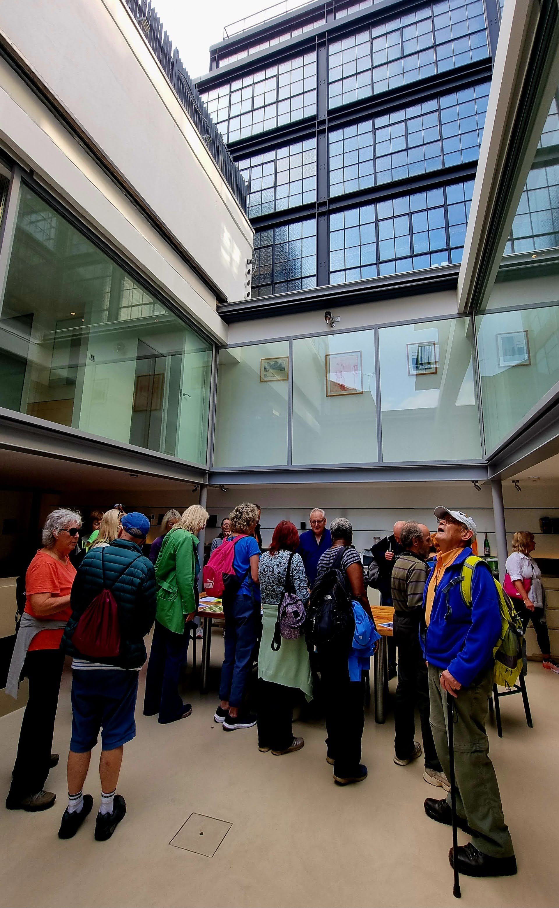 Lincolns Inn Fields was perfect for lunch with café and picnic tables. We spotted an enterprising Brazilian group setting up an extravagant barbecue contrary to all park regs. We then walked to the Bloomsbury quarter and admired the elegant Georgian terraces with blue plaques for Elliot, Wolf, Lutyens and others. At Queens Square we visited the Wiener Holocaust Library, then onto the Art Workers Guild mansion on Russell Square. After losing and finding Derek and Jeff we entered the art deco Senate House, the first London skyscraper, built by Charles Holden and the inspiration for "1984". Last visit was to the secret Japanese Roof Gardens, thanks to Joan for finding the hidden entrance. To Con's astonishment, we forewent the Wetherspoons to end at the hidden Packet Yard pub at Kings Cross, full of former artifacts from the Victorian railway age, after another jolly decent Open House London day.