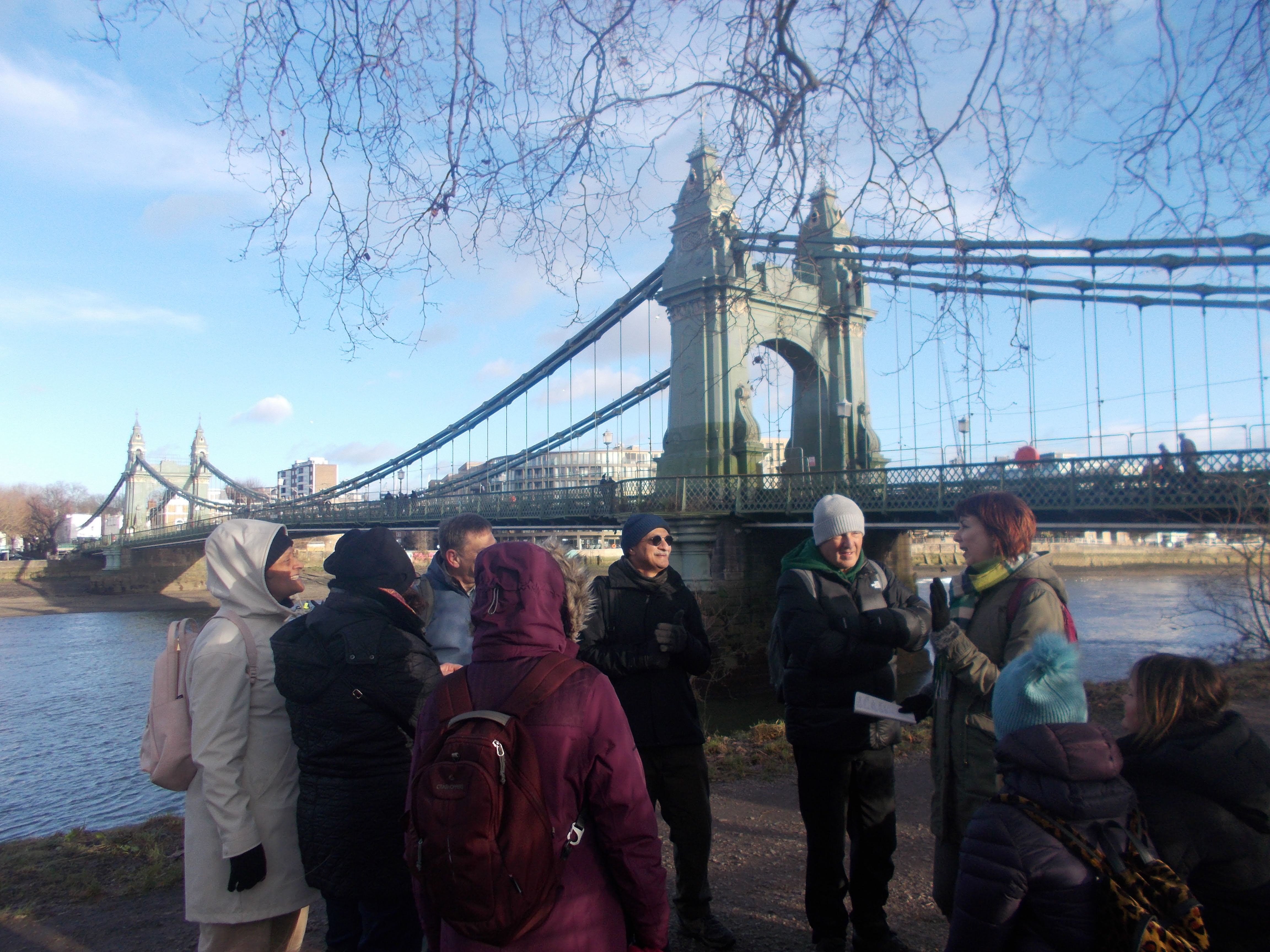 Twelve of us met at Cafe Torelli in Kew Village for hot drinks then set off briskly towards the south bank of the River Thames. We had blue skies and sunshine although the temperatures were a bit nippy. We passed the National Archives and the lovely Grade 2 listed Tube and Overground bridge which has been recently improved with new sleepers, then headed to see this year's Banksy surprise artwork at the side of the 1903 Kew Bridge and Kew Green. As we picked up the pace, we headed along the river past trees adorned with baubles, overhanging the river's edge, wondering how they had been decorated. Our next stop was Chiswick Bridge, then onto Barnes Bridge and finally the fabulous Hammersmith Bridge. This last bridge has been closed to road traffic since April 2019 after cracks in the bridge's supports were discovered. The potential repairs and future of the bridge have since been the subject of much controversy.